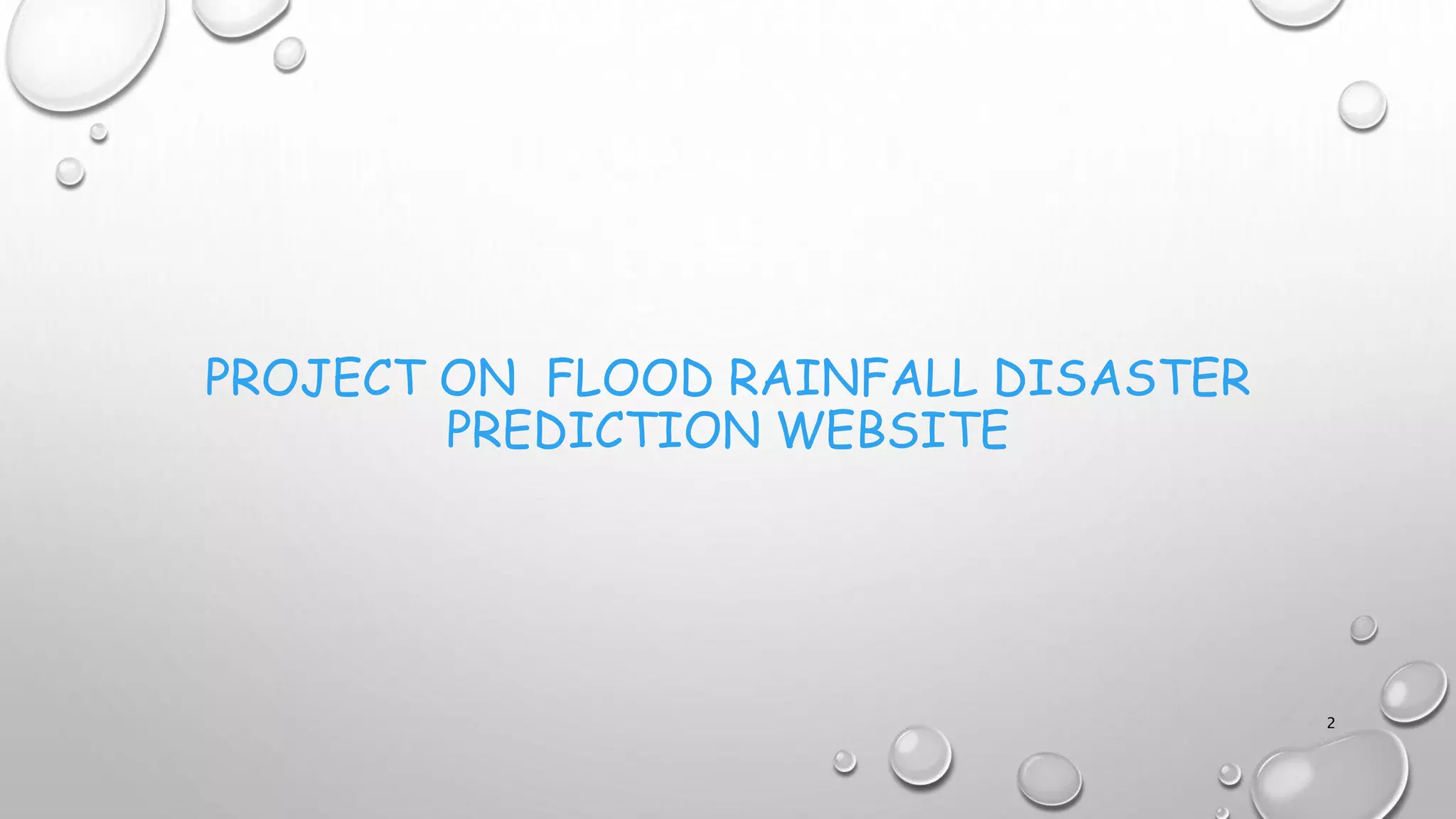 This document introduces a project to build a flood rainfall disaster prediction website. It will provide flood warnings and rainfall analysis to help with disaster response and relief efforts. The website will ingest and analyze flood and rainfall data to train machine learning models. The models will then be used to serve real-time predictions and visualizations through a user interface. This will help alert the public of potential floods and allow preparations to minimize loss.