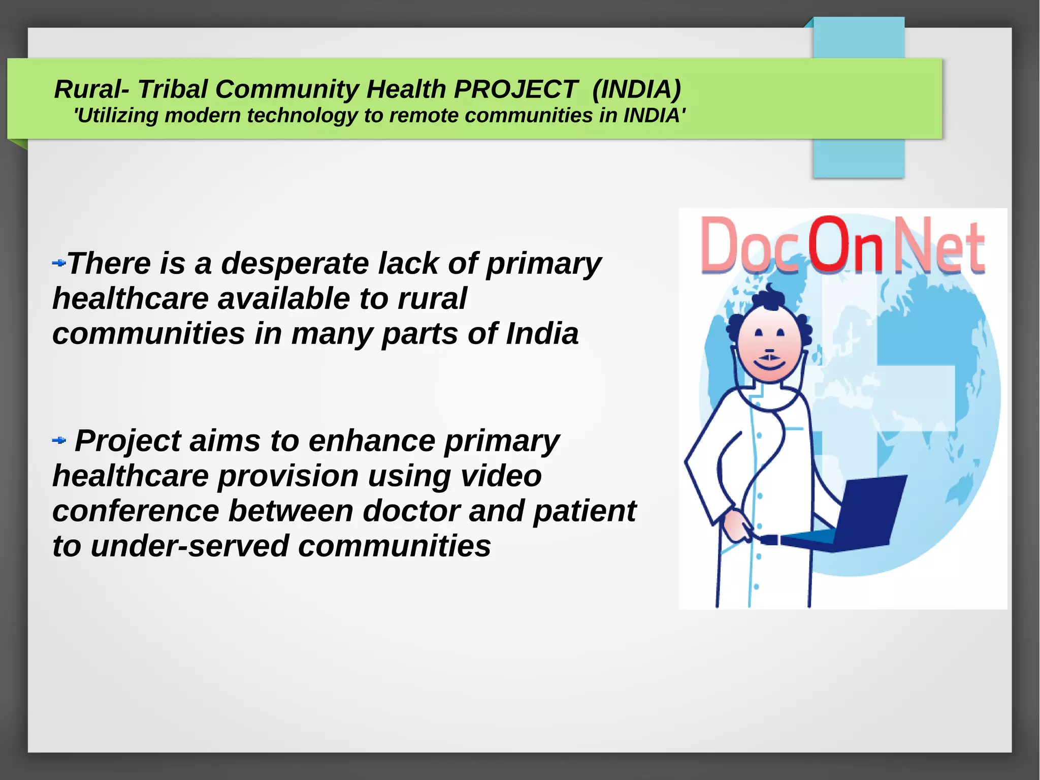 The Rural-Tribal Community Health Project in India aims to enhance primary healthcare in underserved rural areas using telemedicine technology, providing video consultations between doctors and patients. The initiative plans to set up standardized hospitals staffed with trained nurses and equipped with diagnostic facilities to treat over 500 patients monthly, ultimately addressing the healthcare accessibility issues in these regions. Currently, three clinics are operational in Andhra Pradesh, with plans for additional locations, targeting common health issues faced by the rural population.