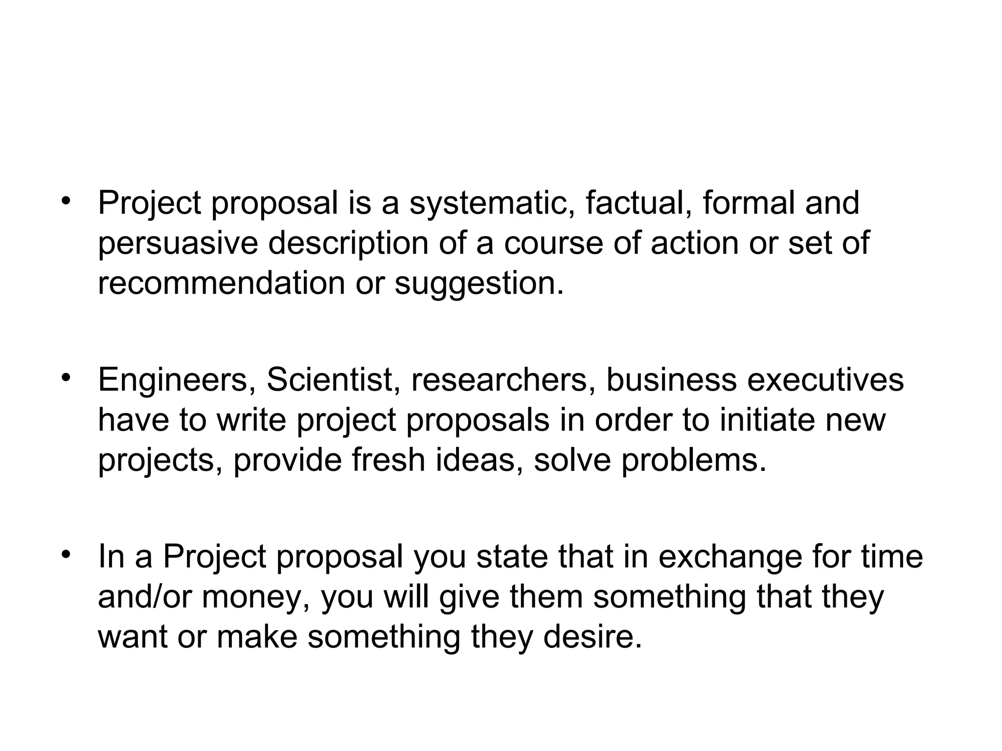 A project proposal is a formal, persuasive document that outlines a course of action to initiate new projects or solve problems. It states that in exchange for funding or resources, the proposer will deliver a desired outcome. Project proposals can be formal or informal, internal or external, and solicited or unsolicited. A formal proposal typically includes sections on the abstract, methodology, problem statement, organizational structure, project plan and schedule, advantages/disadvantages, proposed solution, and conclusion.