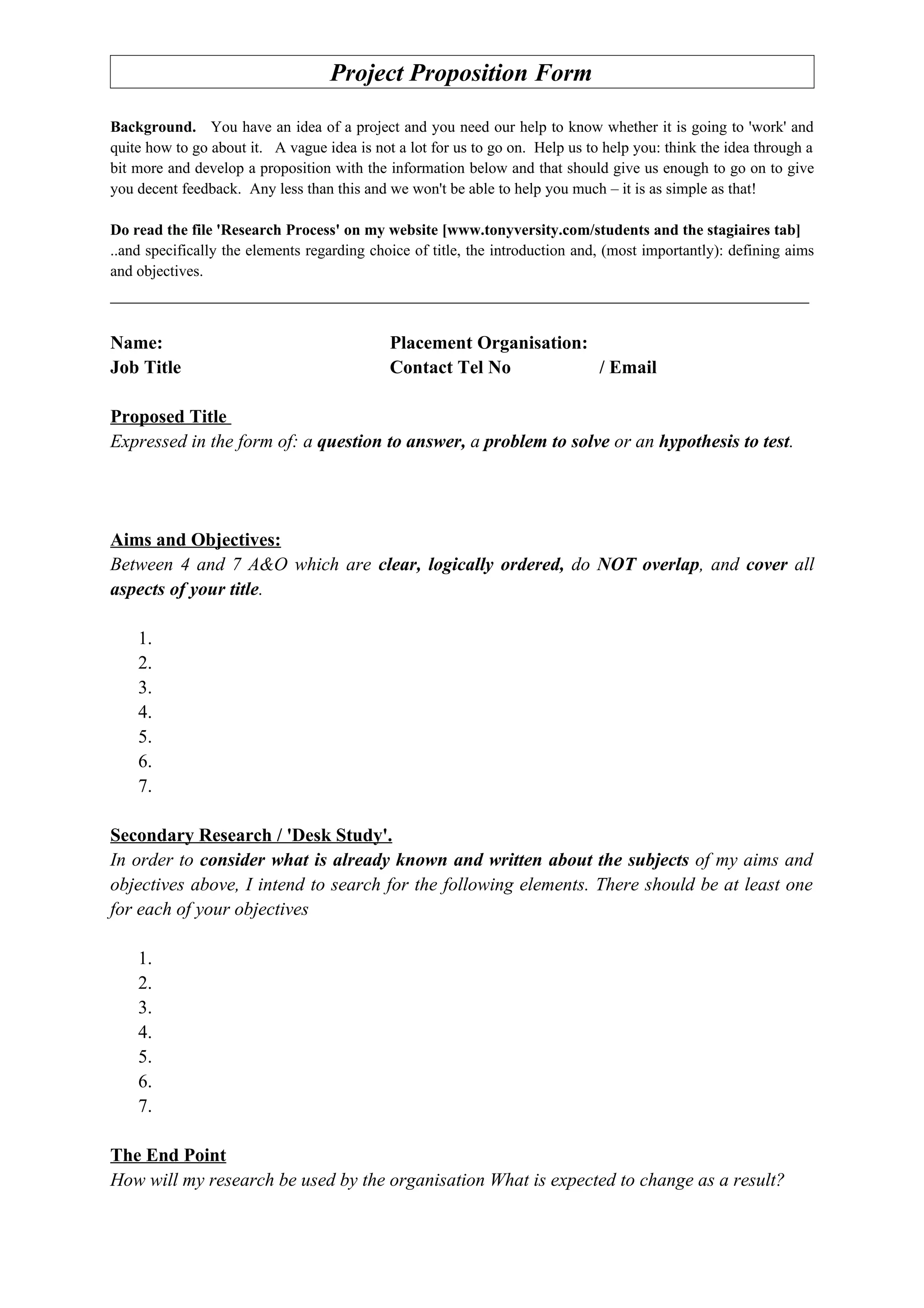 How will my research be used by the organisation What is expected to change as a result?](https://image.slidesharecdn.com/projectpropositionform-100129064903-phpapp02/75/Project-Proposition-Form-1-2048.jpg)
