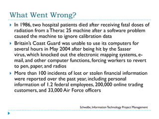 The document discusses the critical importance of Project Quality Management (PQM) throughout project phases, citing examples of failures due to poor quality practices. It outlines the sub-processes of PQM, including quality planning, assurance, and control, emphasizing the need for integrated quality standards and practices. Additionally, it highlights the tools and techniques essential for achieving quality improvement and compliance with stakeholder requirements.