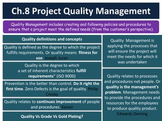 The document discusses quality management processes from Chapter 8 of the PMBOK Guide 5th Edition. It provides details on the three main quality management processes: plan quality management, perform quality assurance, and control quality. For plan quality management, the key inputs, tools and techniques, and outputs are described. This includes developing a quality management plan, quality metrics, and checklists. Perform quality assurance focuses on auditing quality requirements and results from quality control. Control quality involves measuring and recording quality against requirements.
