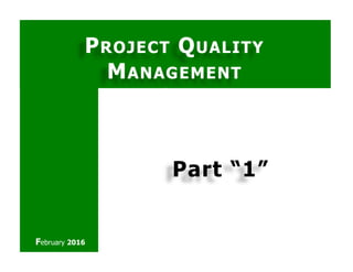 The document discusses project quality management. It defines quality and differentiates it from grade. Quality must be planned for, not just inspected for. Several quality management tools are described that can be used in the Plan Quality process, including cost-benefit analysis, cost of quality analysis, seven basic quality tools like histograms and control charts, benchmarking, design of experiments, and statistical sampling. The key benefit of quality planning is that it provides guidance on how quality will be managed and validated throughout the project.