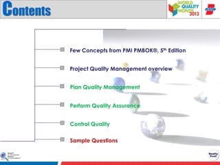 The document provides an overview of project quality management as outlined in the PMI PMBOK® 5th edition. It covers key concepts such as defining quality, the processes involved in quality management, and differences between quality and grade. Additionally, it discusses the importance of planning, performing quality assurance, and controlling quality to ensure that project requirements are met.