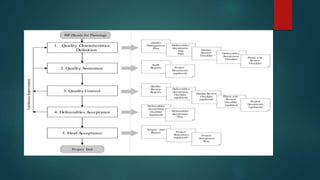Vertex Engineering is presenting their quality management plan for a construction project in Bahria Town, Karachi. The plan outlines their quality objectives, which include verifying control testing, monitoring design and progress, checking dimensions, and inspecting materials. It describes the quality management process, which involves reviewing drawings and maintaining schedule and budget compliance. Key roles and responsibilities are defined, along with the tools and techniques that will be used, such as audits, checklists, and reports. Field inspections, material testing procedures, and quality reports are also covered.
