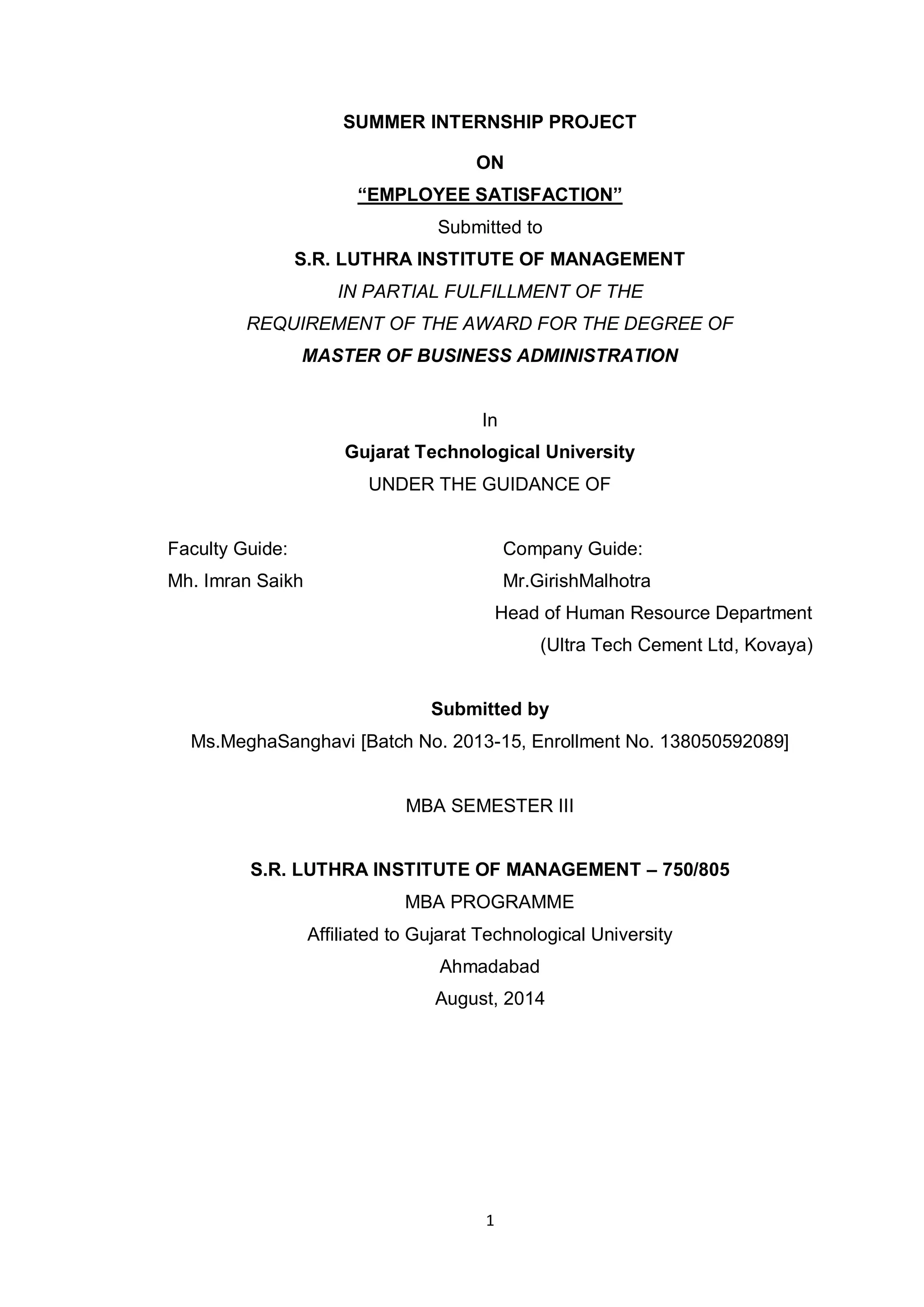 1. The document is a summer internship project report submitted by Megha Sanghavi to the S.R. Luthra Institute of Management in partial fulfillment of an MBA degree.