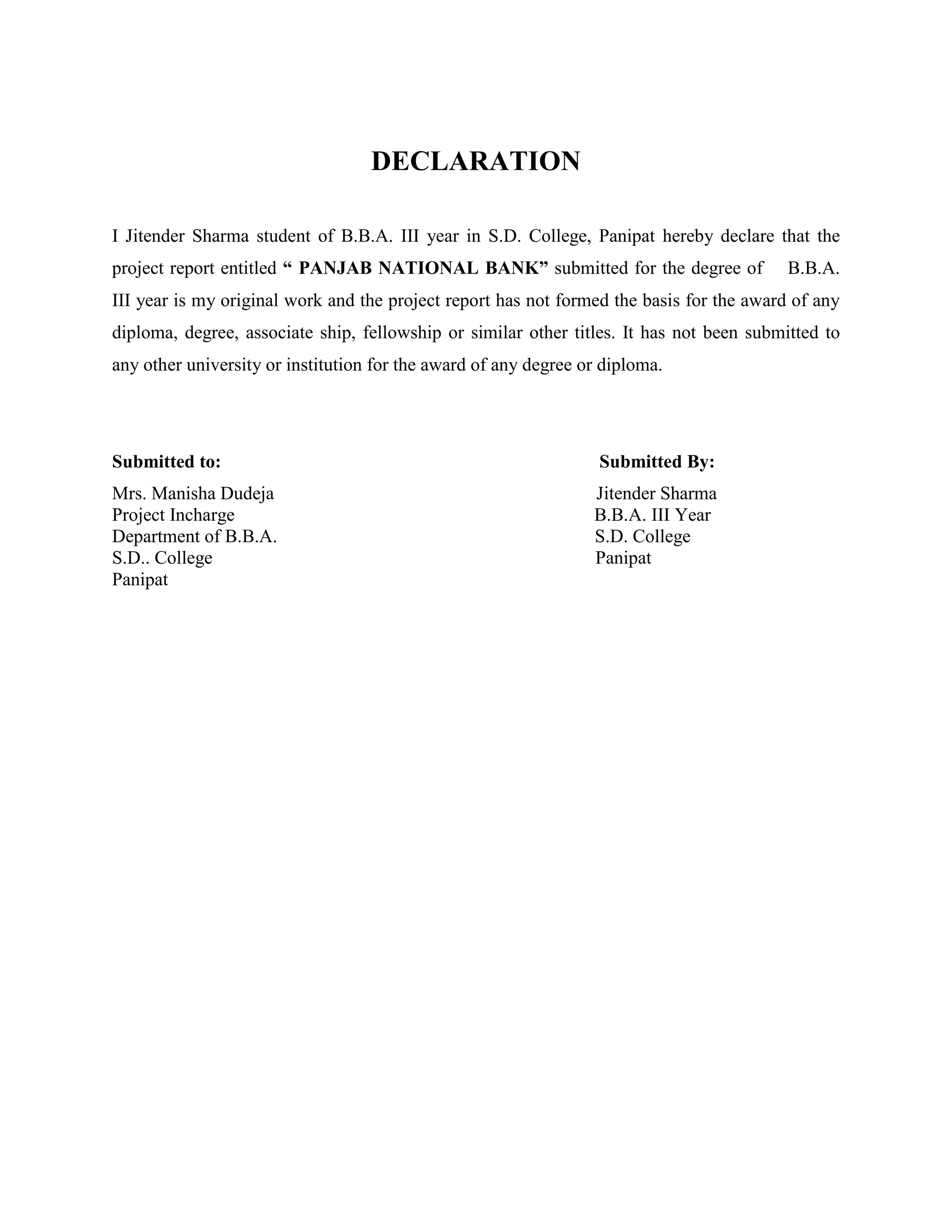 This project report is submitted by Jitender Sharma, a student of B.B.A. III year at S.D. College in Panipat, in partial fulfillment of the requirements for a B.B.A. degree from Kurukshetra University. The report is about Panjab National Bank and was conducted under the guidance of Mr. Jitender Sharma. Jitender declares that the report is his original work and has not been submitted elsewhere. He thanks his professor and parents for their support and guidance during the project.