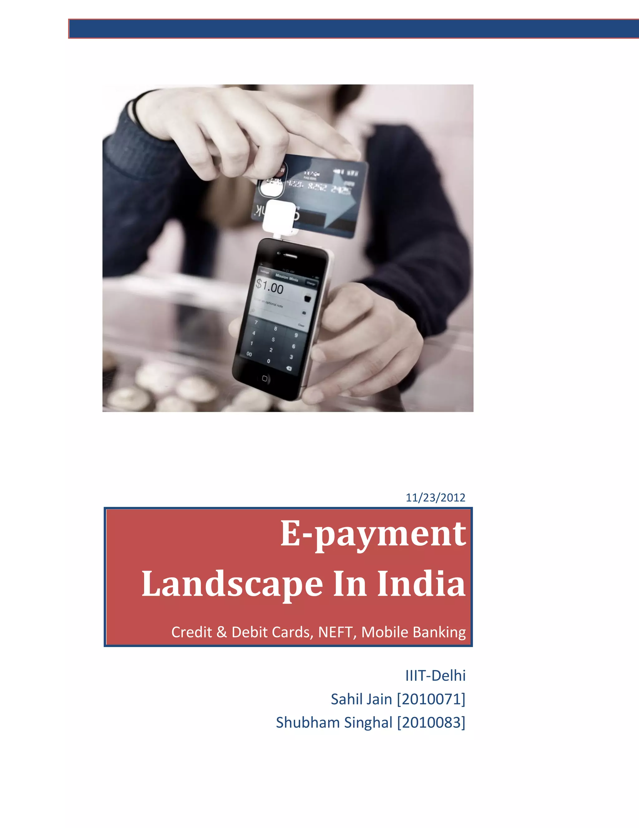 1) Electronic payments in India have grown significantly in recent years, with transactions growing 26.8% from fiscal year 2011 to 2012. Debit cards are the most common card used, with over 102 million in circulation.