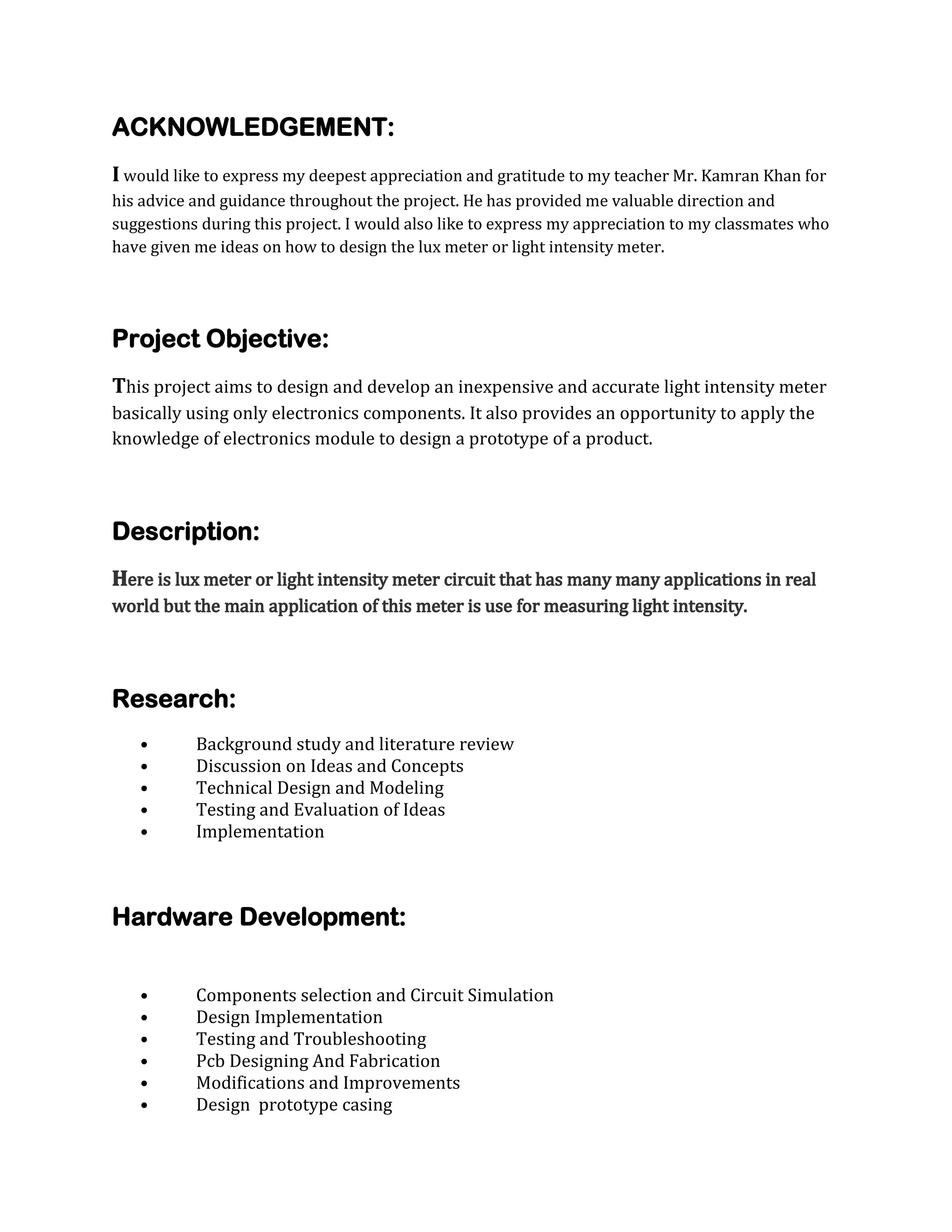 This document describes the design and development of a light intensity meter circuit. The circuit uses a light dependent resistor, voltage divider network, operational amplifiers, analog to digital conversion, and a priority encoder to measure light levels. The output is displayed on a 7-segment display. Key components include an LM324 op-amp, LDR light sensor, 74LS147 priority encoder, and 74LS48 BCD to 7-segment decoder. The circuit aims to provide an inexpensive and accurate way to measure light intensity with a range of 0-2000 lux.