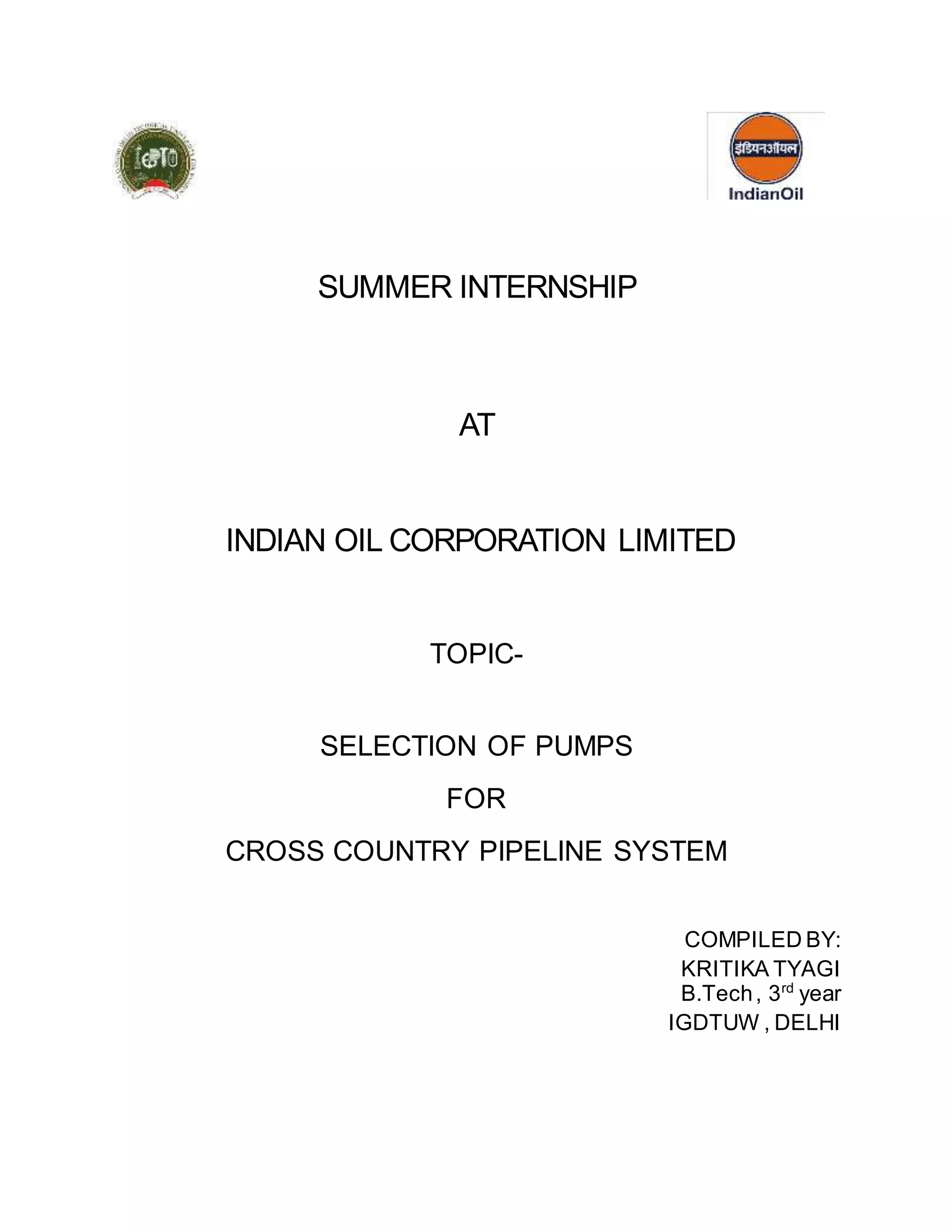This document provides an overview of Indian Oil Corporation Limited (IOCL) and discusses the objective of selecting pumps for their cross-country pipeline system. IOCL is India's largest oil and gas company, with a large refining capacity and extensive retail network. The document discusses the types of pumps used in oil industries, focusing on centrifugal pumps. It explains that the objective is to understand IOCL's pump selection process by examining key pump characteristics like pressure, velocity and head, and how these are used to create characteristic curves and select pumps to keep costs low and efficiency high.