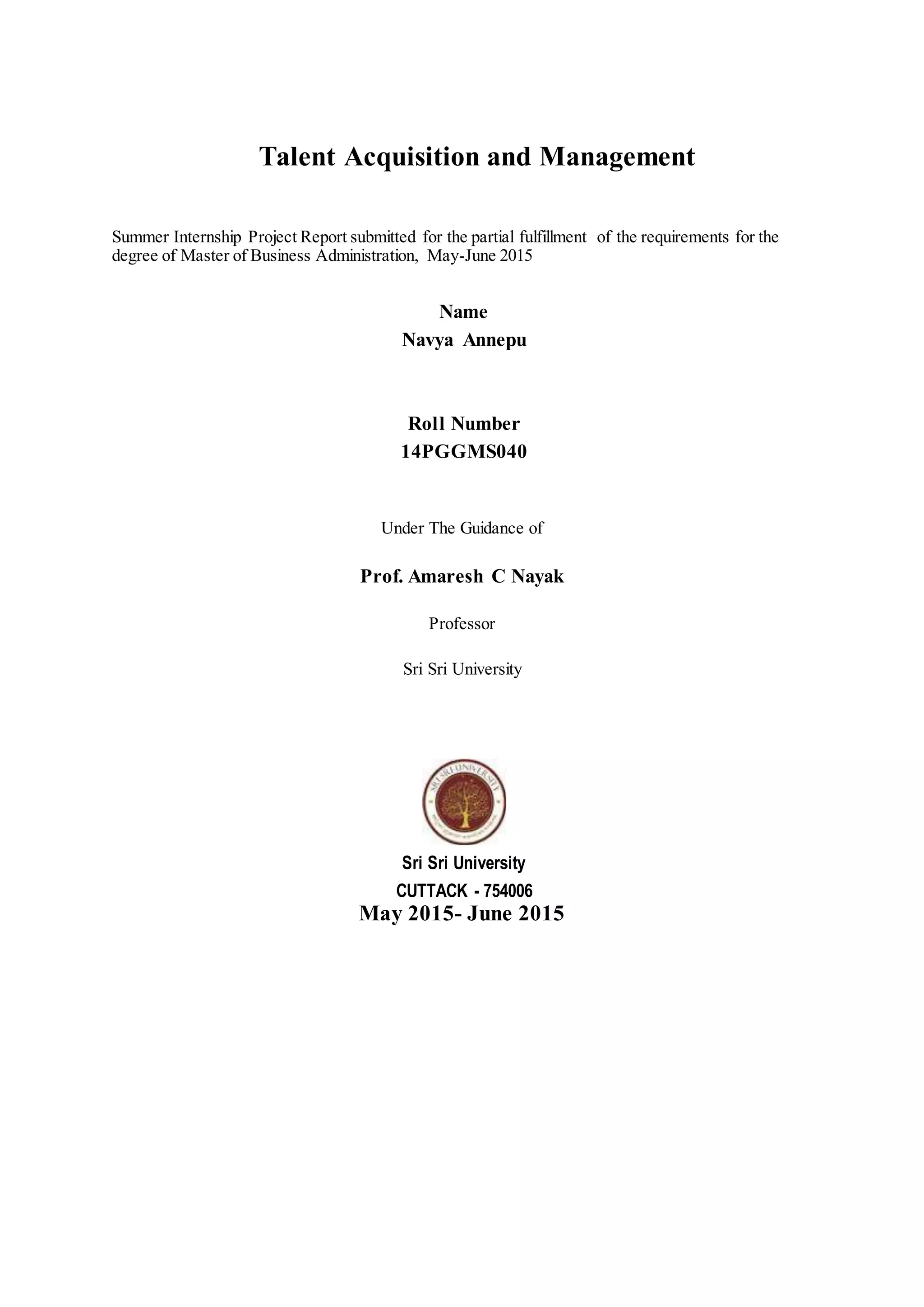 The document discusses talent acquisition and management processes at Trianz. It provides an overview of Trianz, including what they do, their clients and culture. It then describes the talent acquisition process in detail, from generating hiring requests to onboarding new candidates. Key steps include sourcing profiles, screening, interviewing, selection, negotiations and making offers. The document also includes sections on the organizational profile of Trianz, literature review on talent acquisition strategies, and tables and figures to support the recruitment process description.
