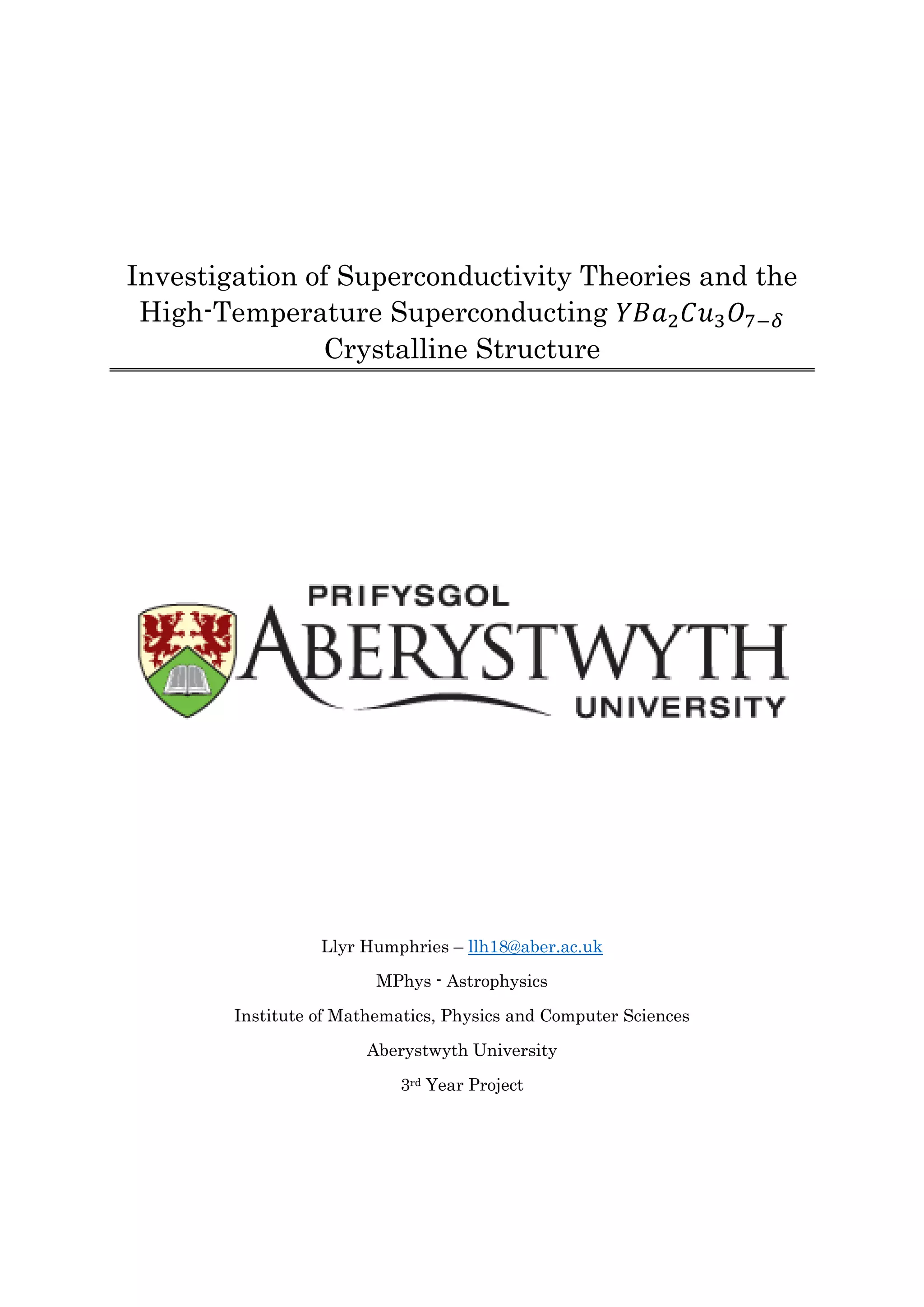This document summarizes an experiment investigating high-temperature superconductivity in Yttrium Barium Copper Oxide samples. The experiment aimed to demonstrate the Meissner effect and zero resistance in the samples using liquid nitrogen. The document provides theoretical background on superconductivity, including the Meissner effect, Ginzburg-Landau theory, BCS theory, and the structure of Yttrium Barium Copper Oxide. It describes the experimental methods, results from Meissner effect tests, magnetic field experiments, X-ray diffraction analysis, and resistance measurements. The results are then discussed in relation to the theories of superconductivity.