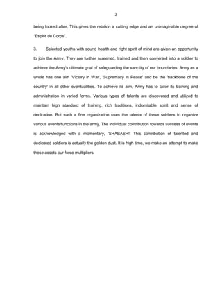This document discusses conducting a study to identify functions and events at military peace stations that could be outsourced to civilian agencies. It provides background on the military station in Bathinda, India which was selected as the location for the case study. The objectives are to identify functions currently performed by the military that could be outsourced, develop guidelines for outsourcing, and evaluate the costs of the current and outsourced systems. Primary and secondary data will be collected from the Bathinda military station and nearby army brigade to analyze events like New Year celebrations and determine which functions outsourcing could benefit.