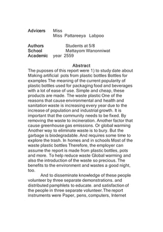 This project report was submitted by students at Mattayom Wanonniwat school to their advisor Miss Pattareeya Labpoo. The report studied making artificial pots from plastic bottles as a way to reduce waste and environmental problems. It discussed the large amount of plastic waste produced and proposed reusing plastic bottles to make pots as an alternative to disposal methods like burning or burying plastic. The students conducted three volunteer demonstrations distributing pamphlets to educate people about making pots from bottles and received positive feedback from participants.