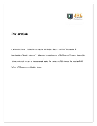This document is a project report on the promotion and distribution of Amul ice cream. It provides background information on Amul and its ice cream business. Amul launched ice cream in 1996 and has since become the top brand in India with a 38% market share. The report discusses Amul's objectives, supply chain network, distribution challenges, and opportunities for expanding its business through new products and improved distribution. It also includes a SWOT analysis of Amul ice cream that examines its strengths in brand recognition and product quality against weaknesses in advertising and packaging.