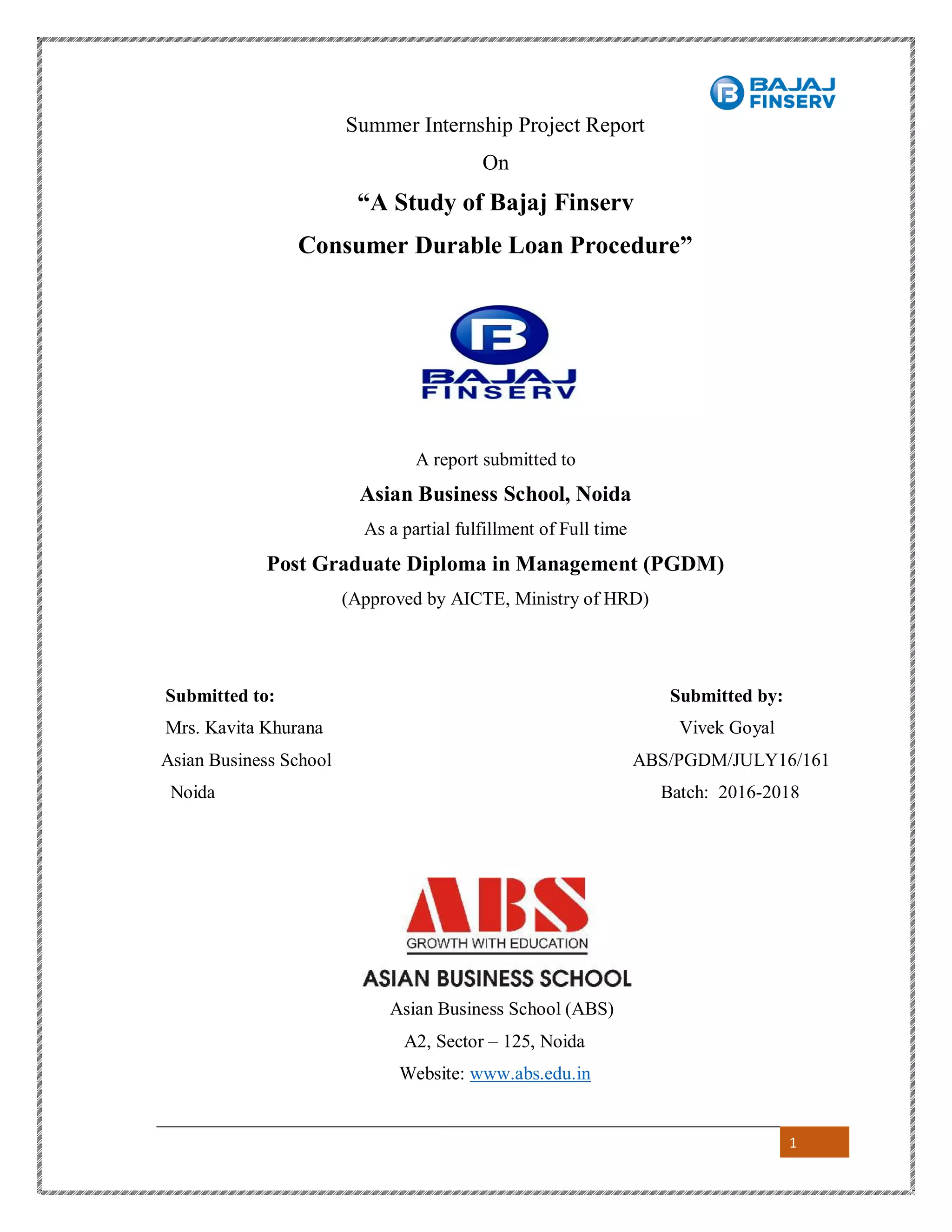 The document is a summer internship project report by Vivek Goyal on the consumer durable loan procedure at Bajaj Finserv, submitted to Asian Business School as part of his PGDM program. It includes details of the research methodology, data analysis, findings, and recommendations based on firsthand and secondary data collected during the internship. The report emphasizes Bajaj Finserv's role in the consumer durable finance sector and discusses various financial products and processes involved.