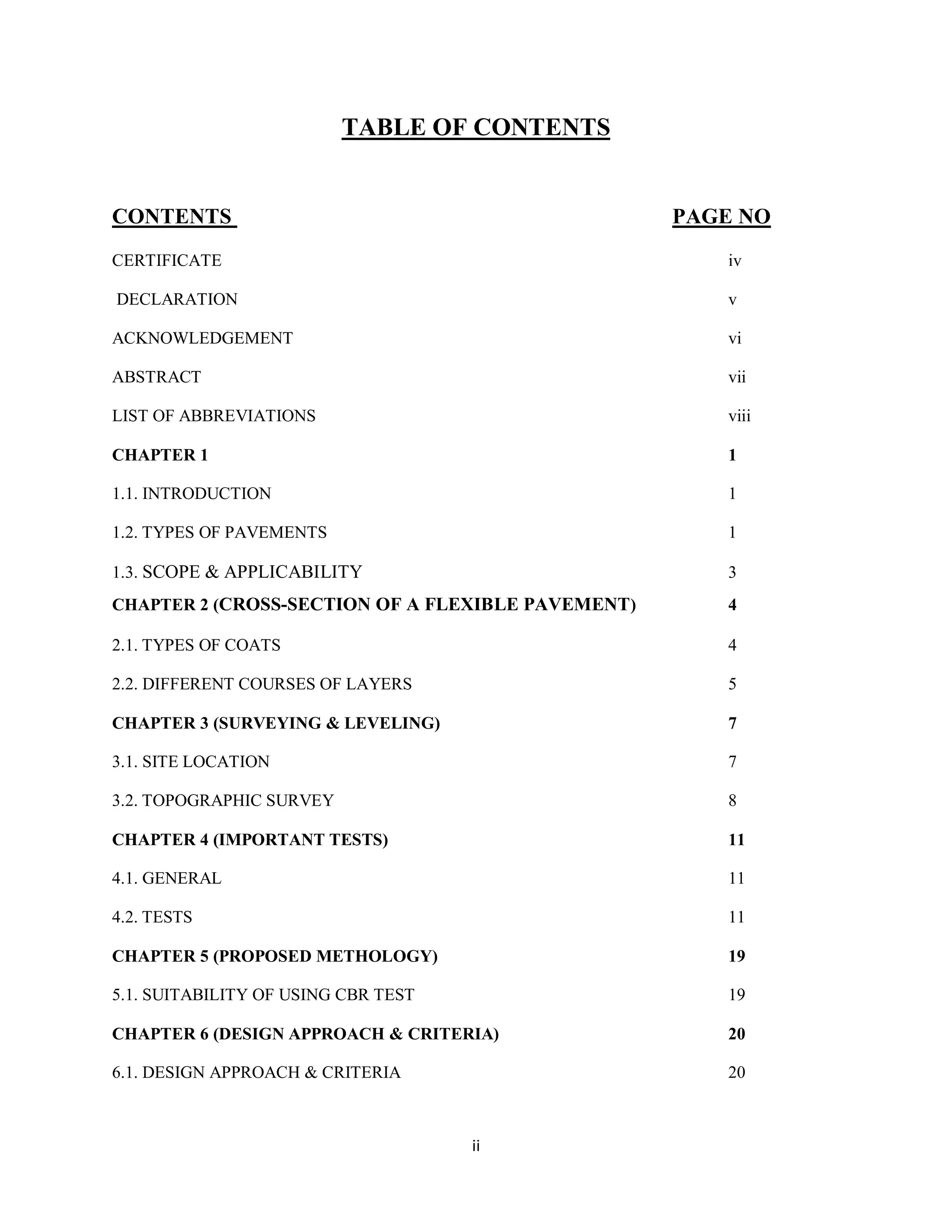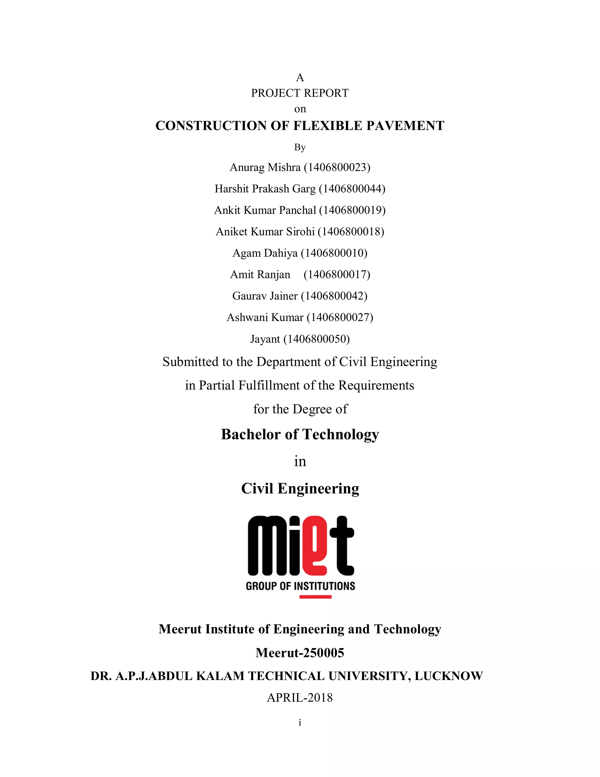 This document is a project report on the construction of a flexible pavement. It includes chapters on the different layers of a flexible pavement cross-section, surveying and leveling of the construction site, important tests to be conducted, the proposed methodology, design approach and criteria, estimation of quantities and costs, types of failures that can occur in flexible pavements, overview of required plant and machinery. The report is submitted in partial fulfillment of the Bachelor of Technology degree in Civil Engineering and includes certificates, declarations and acknowledgements.