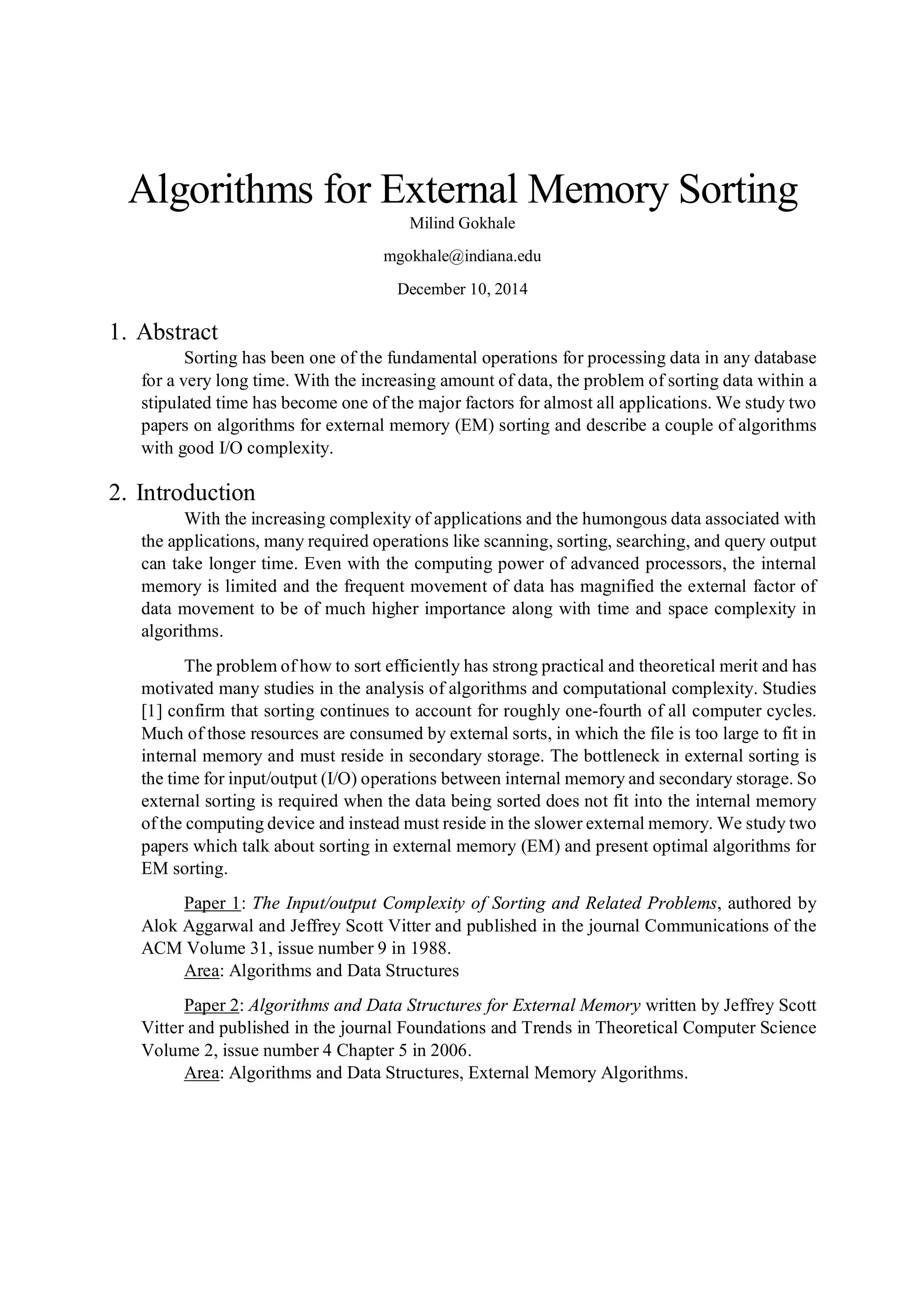 The document discusses algorithms for external memory (EM) sorting, highlighting their significance due to the increasing volume of data that exceeds internal memory capacities. It evaluates two papers on optimal EM sorting algorithms, specifically focusing on distribution sort and merge sort, and their I/O complexities. The conclusion emphasizes the similarities and differences between these algorithms in terms of efficiency and usage of memory hierarchy.