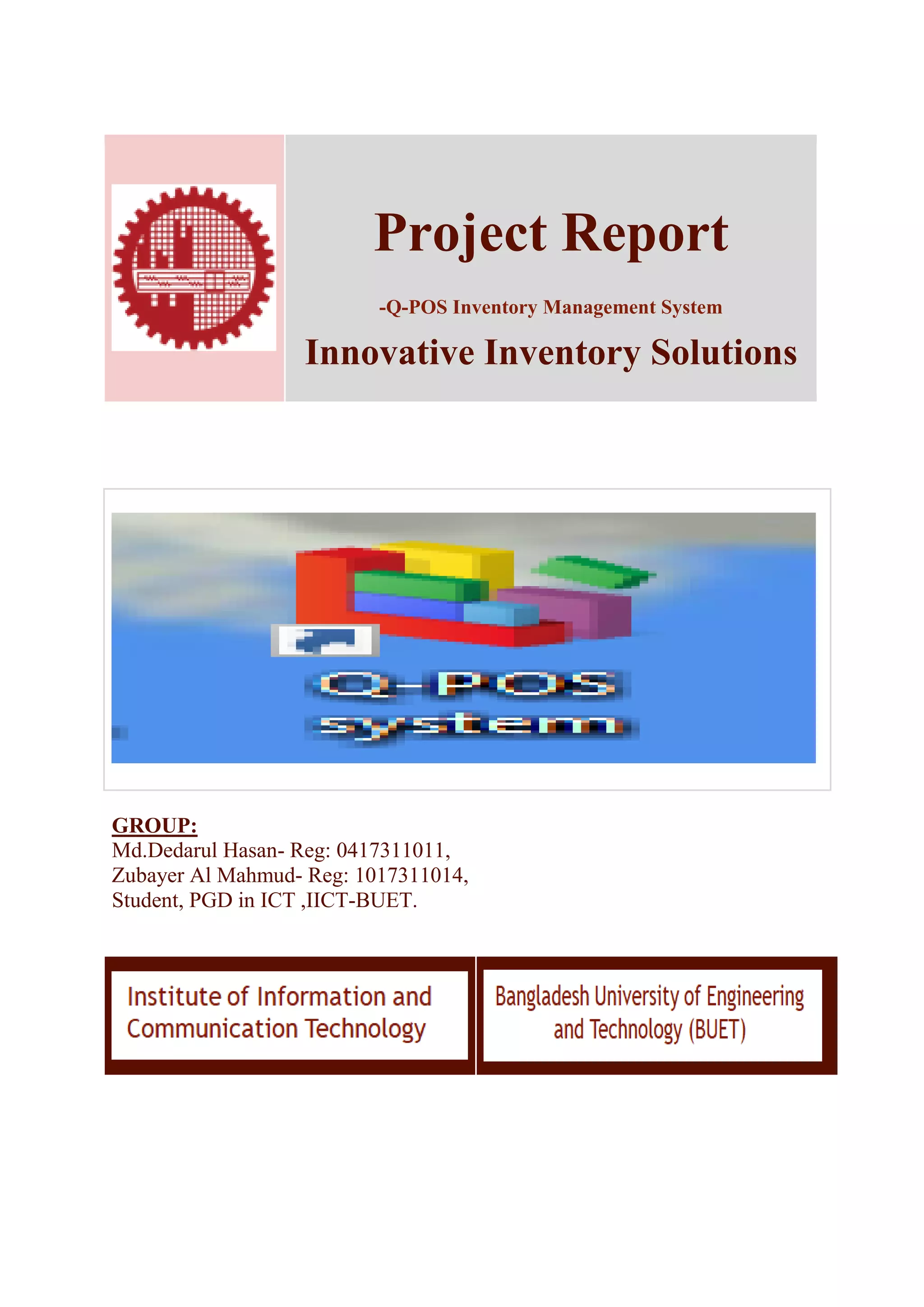 The document provides details about the Q-POS Inventory Management System project. It describes the purpose of the system as tracking inventory, sales, orders and deliveries for small shops and stores. The system aims to help avoid overstocking or outages through features like order management, inventory tracking, and product identification. It also seeks to predict future inventory needs based on special events or seasonal changes. The document outlines the user interface, database design, and various system functions for inventory management, purchases, sales, and reporting.