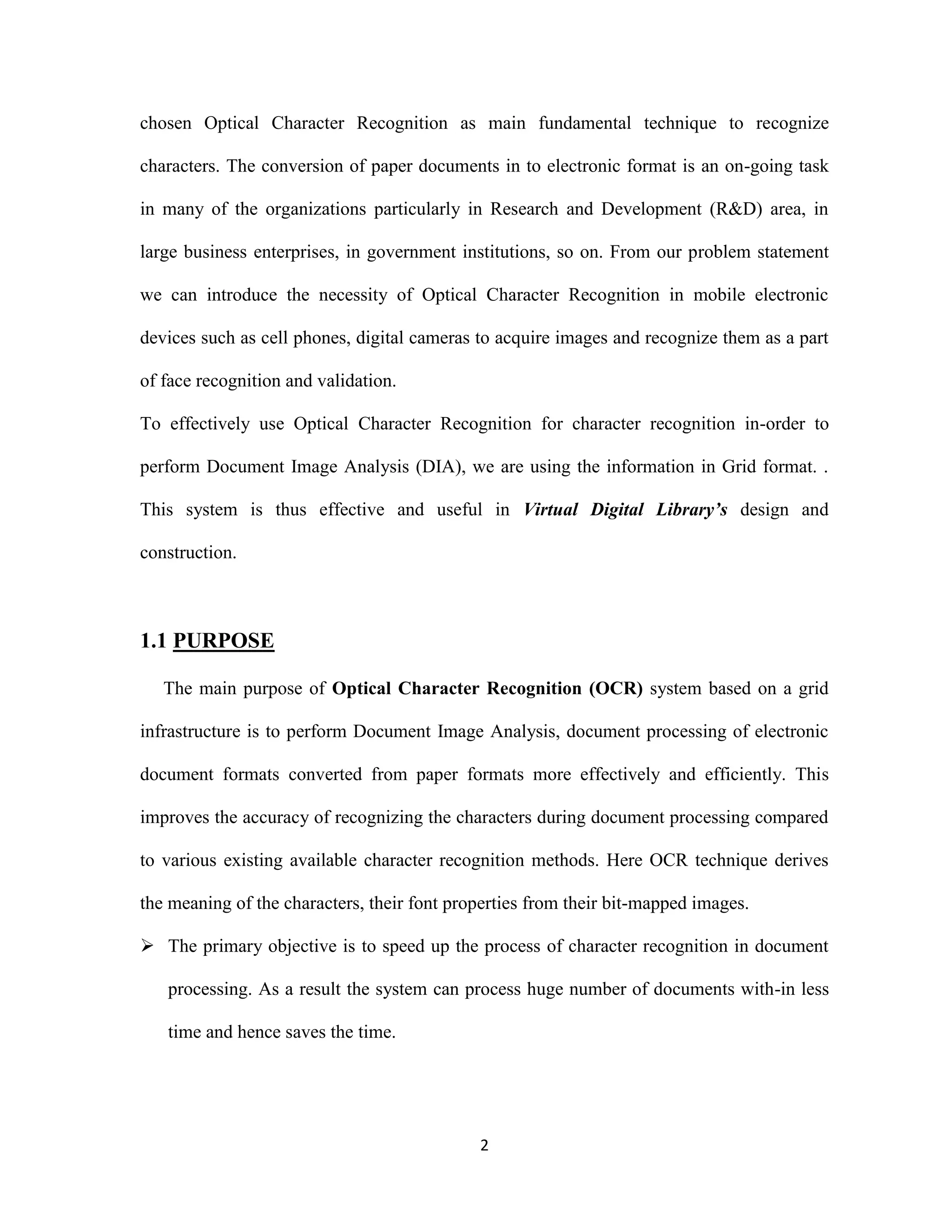 The document discusses the development of an Optical Character Recognition (OCR) system based on a grid infrastructure to improve document image analysis by recognizing characters from multiple languages efficiently. This proposed system addresses limitations of existing OCR systems, which primarily supported only a single language and lacked functionalities for searching and editing. The document outlines the technical, operational, and economic feasibility studies of this OCR system, emphasizing its benefits for research, academic, and governmental organizations.