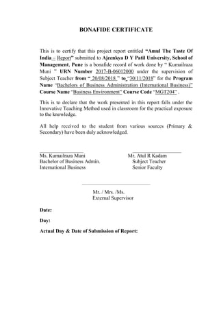 The document is a project report submitted by Kumail Raza Muni on Amul, exploring various aspects of the dairy cooperative including its operational strategies, organizational structure, and the impact of internal and external factors on its performance. It highlights Amul's role in the white revolution in India, its global reach, and the importance of effective inventory management. The report aims to provide insights into improving the organization's operations and its competitive stance in the dairy industry.