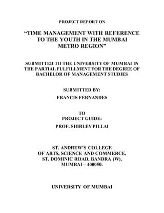 This document is a project report submitted by Francis Fernandes to Prof. Shirley Pillai at St. Andrew's College of Arts, Science and Commerce in Mumbai, India. The report examines time management among youth in the Mumbai metro region and was submitted in partial fulfillment of the requirements for a Bachelor of Management Studies degree from the University of Mumbai for the academic year 2008-2009.