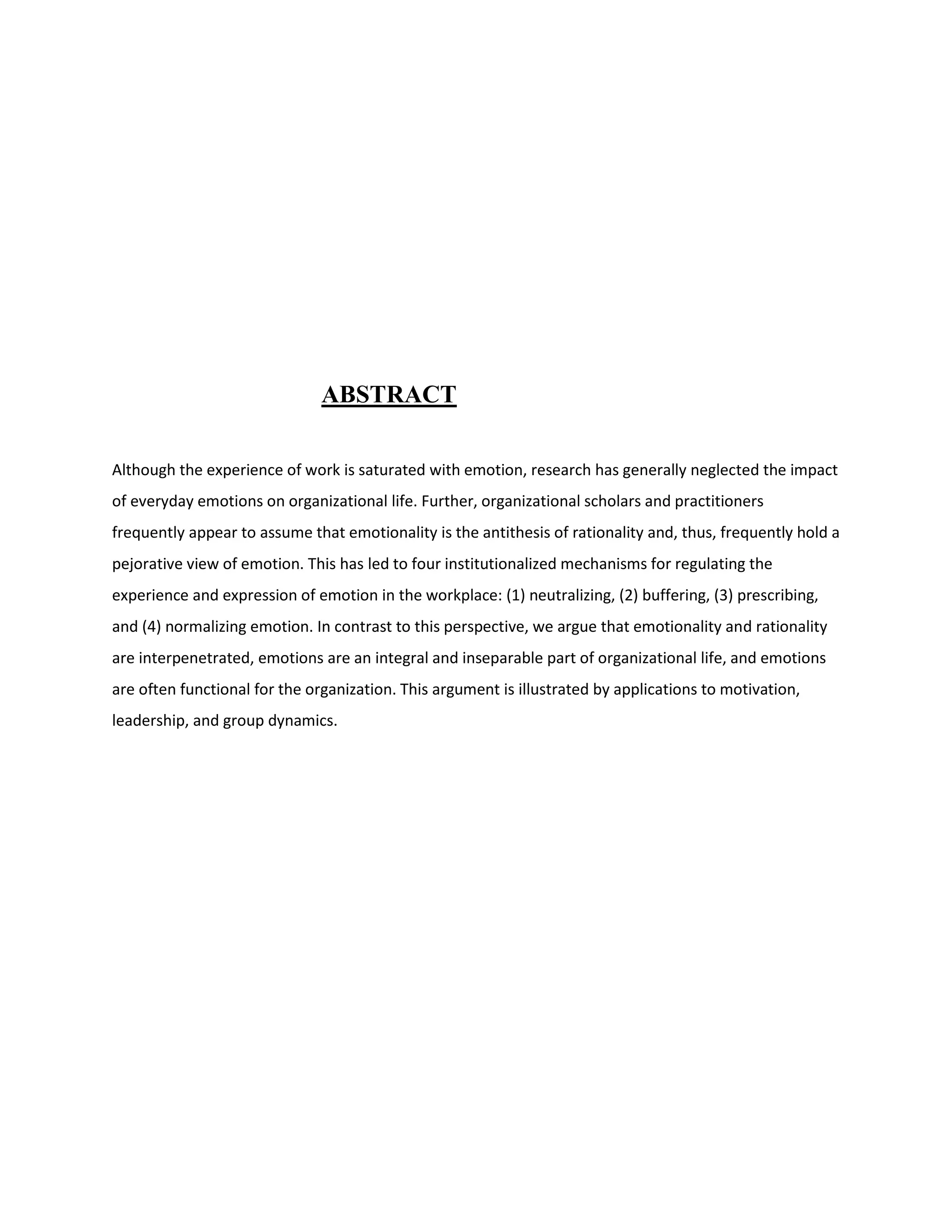 The document discusses the significant role of emotions in the workplace, highlighting how they're often misperceived as purely irrational elements contrary to rationality. It emphasizes that emotions are integral to motivation, leadership, and group dynamics, and outlines mechanisms for regulating emotions while also introducing concepts like emotional intelligence and emotional labor. A deeper understanding of emotions can enhance workplace interactions and improve organizational outcomes, suggesting that managing emotions effectively is crucial for both individual and organizational success.