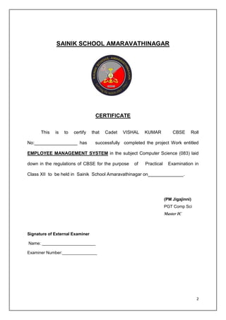 The document describes a project report on an Employee Management System created by a student named Vishal Kumar. It includes an introduction describing the project, objectives, proposed system, and phases of the system development life cycle used to create the software. The project uses SDLC methodology and includes phases for initiation, concept development, planning, design, implementation, testing, and maintenance.