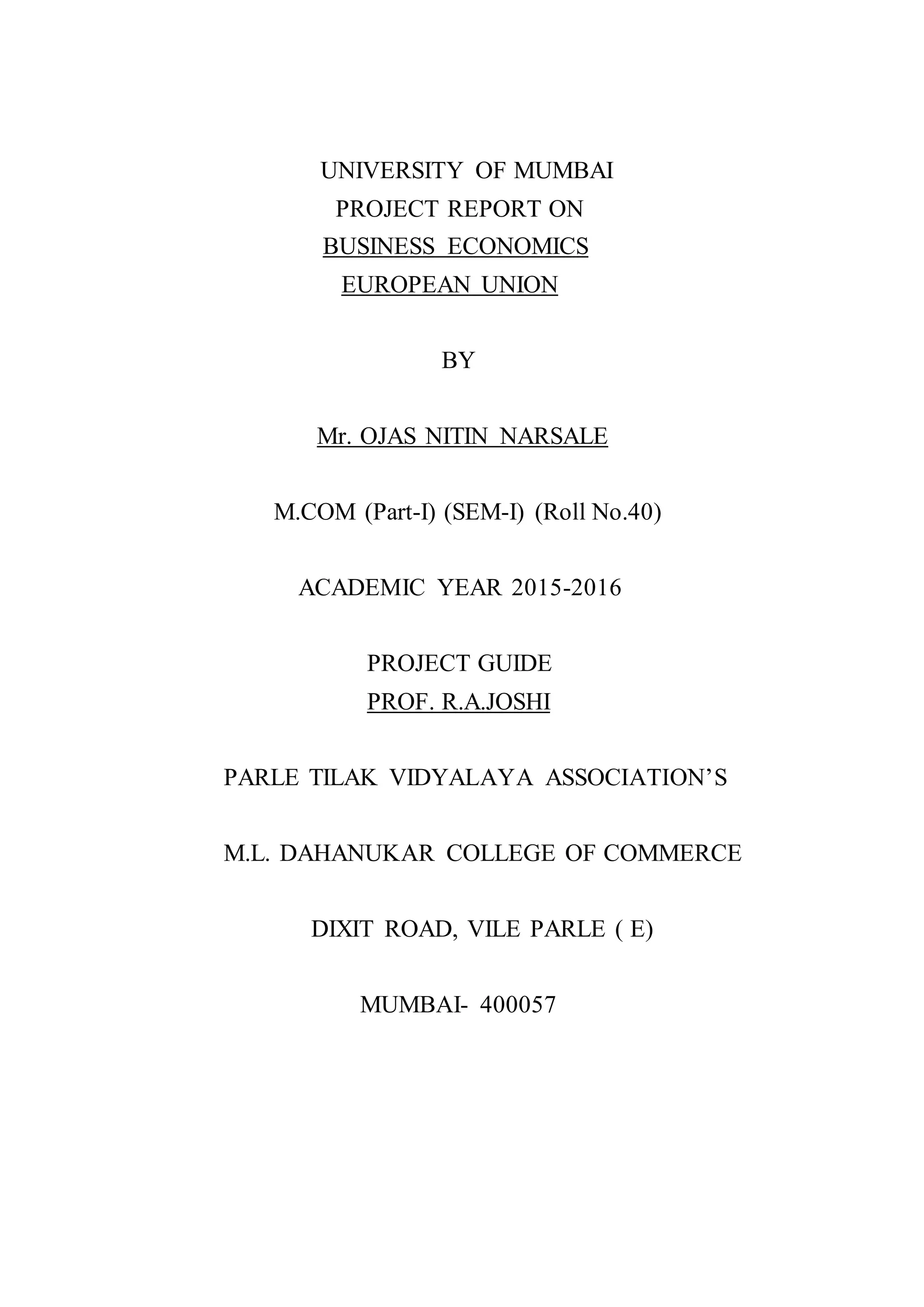 The document is a project report submitted by Mr. Ojas Nitin Narsale to the University of Mumbai on the topic of the European Union. It includes sections on the history, member states, politics, budget, legal system, fundamental rights, key acts, foreign relations, and economy of the European Union. The report was completed in the 2015-2016 academic year under the guidance of Professor R.A. Joshi at the M.L. Dahanukar College of Commerce in Mumbai, India.