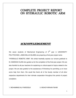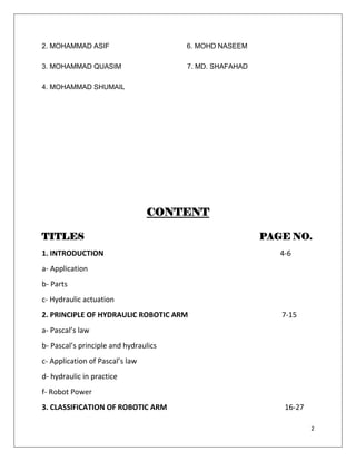 The document describes a project report for a hydraulic robotic arm. It includes an acknowledgements section thanking those involved. The content section lists topics to be covered such as introductions, principles of hydraulic robotic arms, classifications of robotic arms, conceptual design and methodology, development of the model, safety precautions, and future scope. It then provides details on the introduction, including applications in assembly lines and construction, the parts involved, and hydraulic actuation using syringes. It also explains the principles of hydraulic systems, including Pascal's law which states that pressure in an enclosed fluid is transmitted equally in all directions.