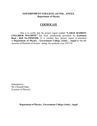 The document is a seminar report on the Large Hadron Collider (LHC) prepared by Jyotismat Raul for his Bachelor's degree in Physics, detailing the LHC's construction, technical specifications, and scientific goals. It outlines the LHC's significance in advancing particle physics by exploring fundamental questions, including the origins of mass, dark matter, and antimatter. The report also includes acknowledgments, an introduction to the LHC's operational principles, and an overview of its key experiments and detectors.