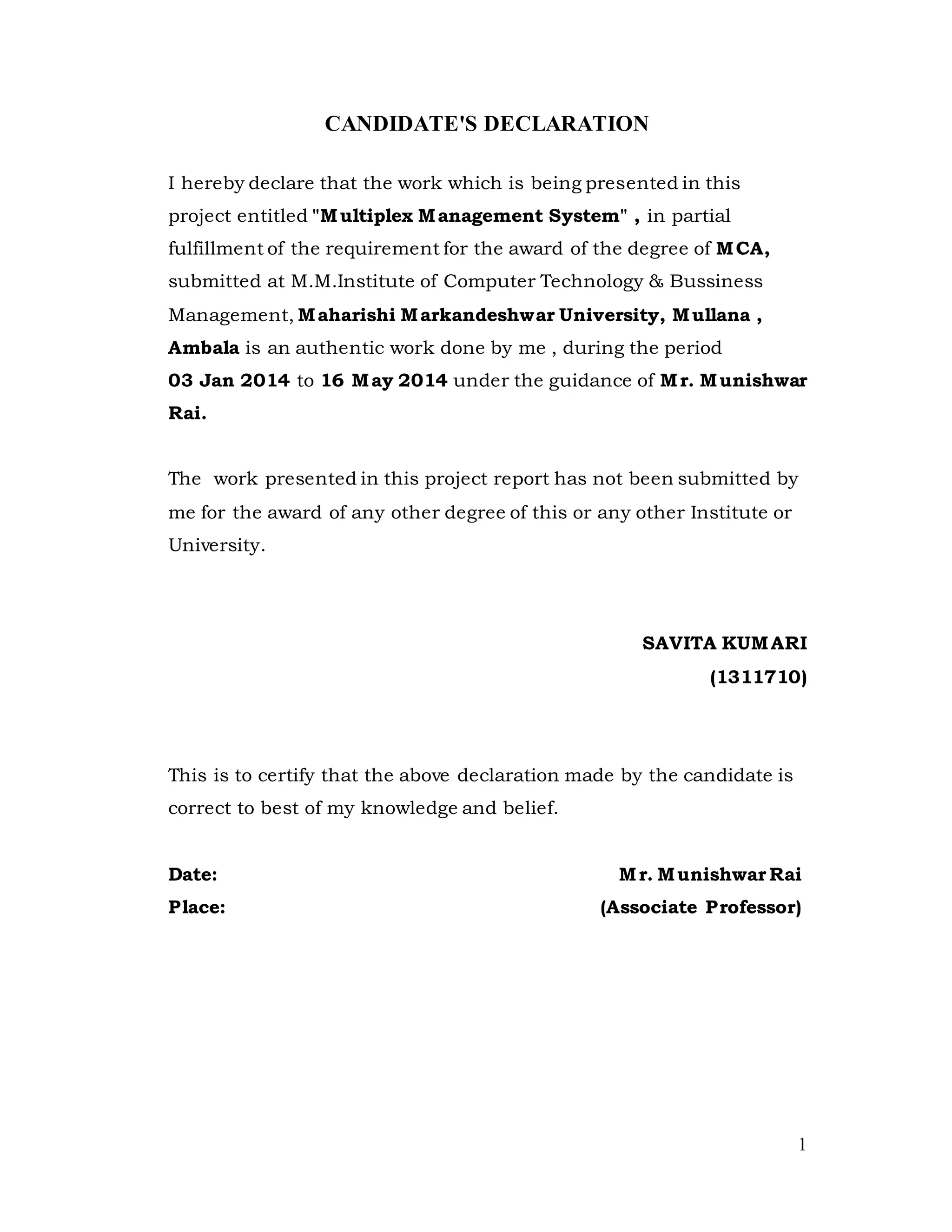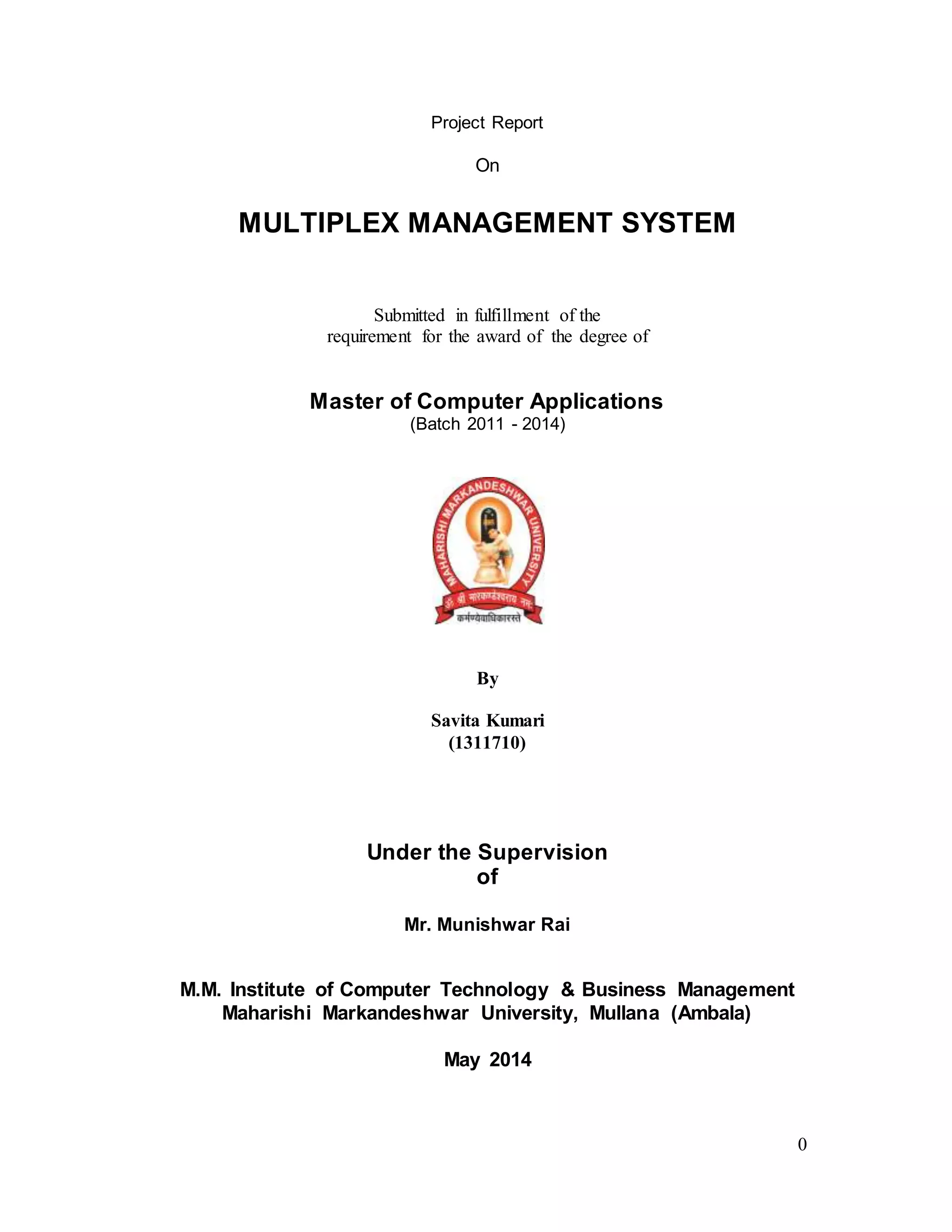 The document is a project report on the 'Multiplex Management System' completed by Savita Kumari as part of her Master's degree in Computer Applications. It outlines the system's purpose to streamline multiplex operations such as ticket booking, brand management, and sales tracking, while also detailing the software development life cycle phases and technical specifications. The report emphasizes the various functionalities that improve efficiency and user experience in managing multiplexes.