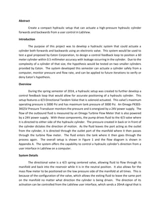 A hydraulic system was developed to actuate a cylinder forwards and backwards using an electronic valve. The system includes a directional valve, pressure transducer, and flow meter connected to a computer interface. It allows monitoring and controlling the cylinder's position. The interface displays pressure, flow rate, and includes controls to move the cylinder or return it to neutral. This provides a test system for developing feedback control of hydraulic cylinders.