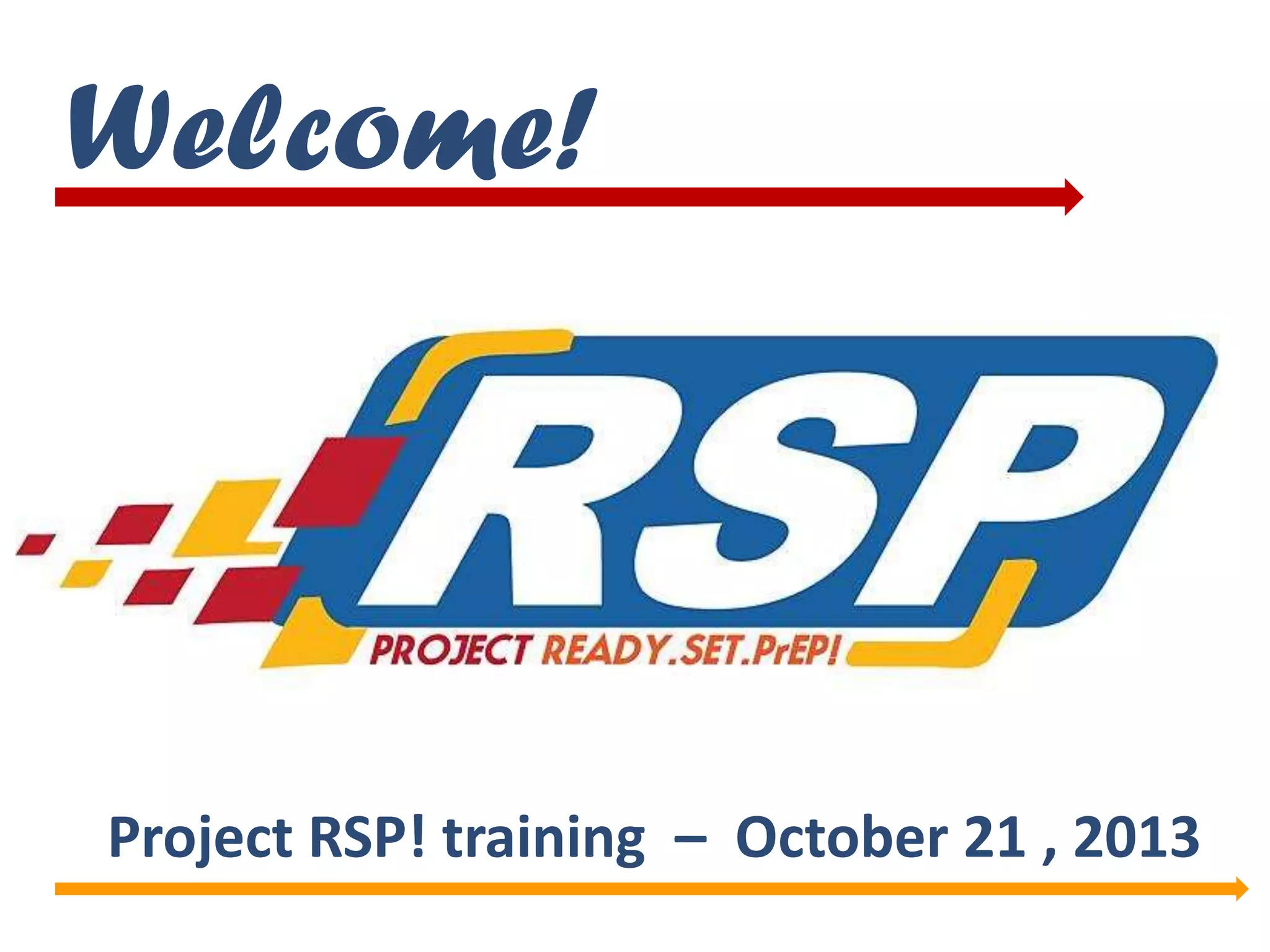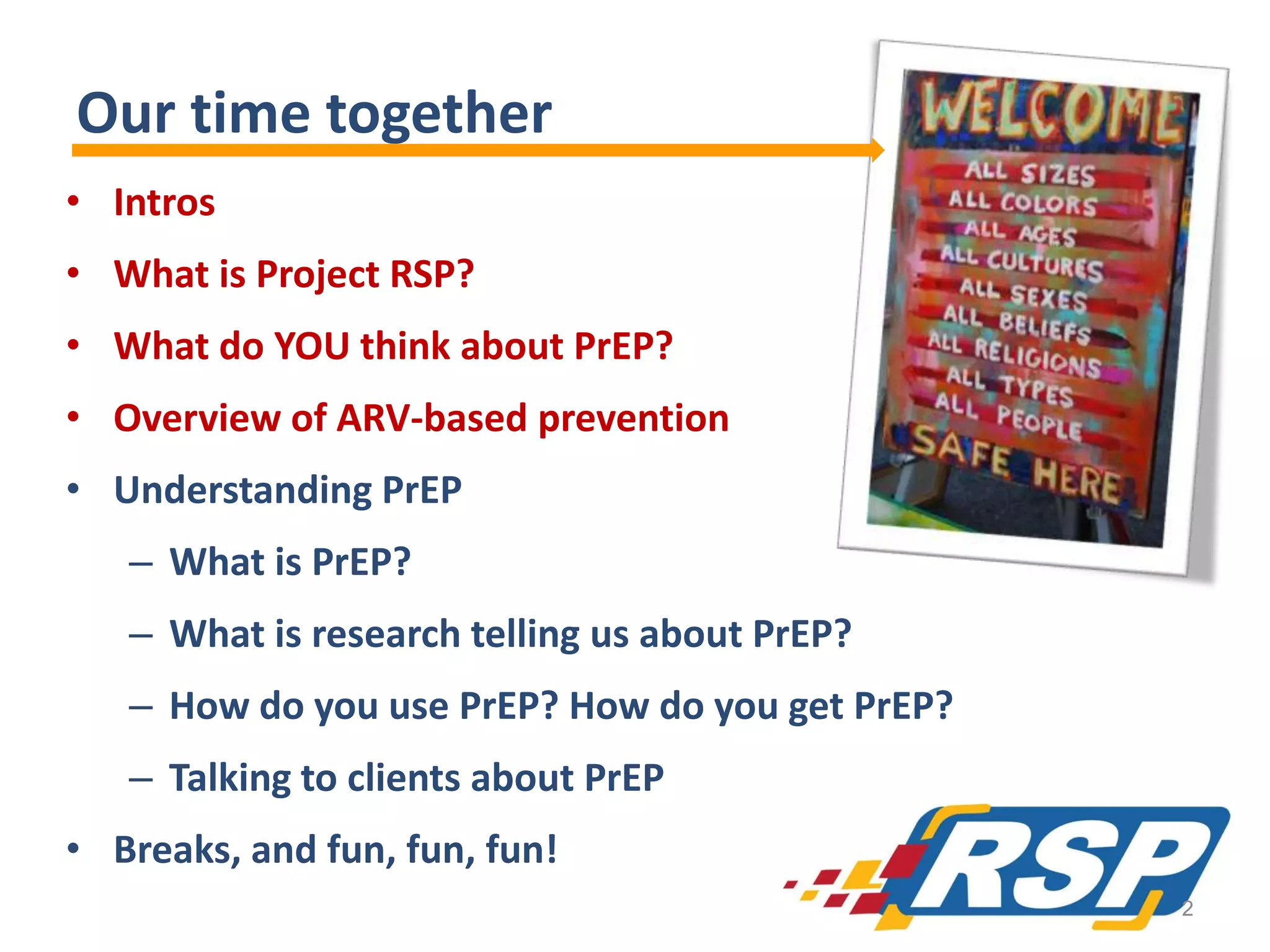 The document outlines a training session on Project RSP, focusing on understanding pre-exposure prophylaxis (PrEP) as an HIV prevention strategy. It emphasizes education about PrEP, community experiences, and the importance of adherence to medication for effectiveness. Additionally, it provides insights into accessing PrEP, discussing research findings, and addressing misconceptions around its use and effectiveness.