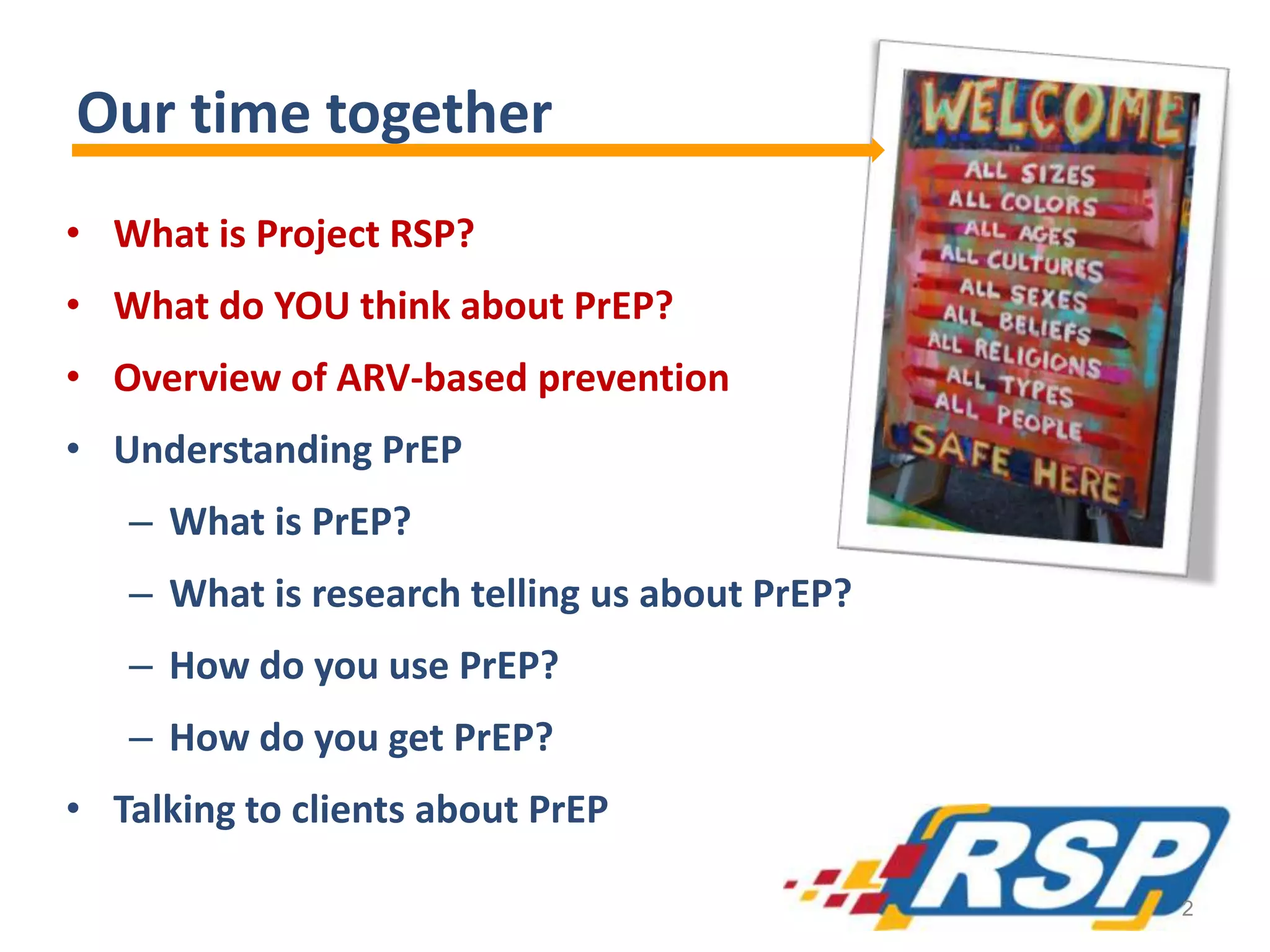 The document outlines Project RSP, focusing on training and community engagement regarding pre-exposure prophylaxis (PrEP) for HIV prevention. It discusses the importance of adherence to PrEP, research findings on its effectiveness, and the necessary medical protocols for prescribing it. Additionally, it highlights ongoing research and the need for comprehensive strategies that include education, counseling, and support in HIV prevention efforts.