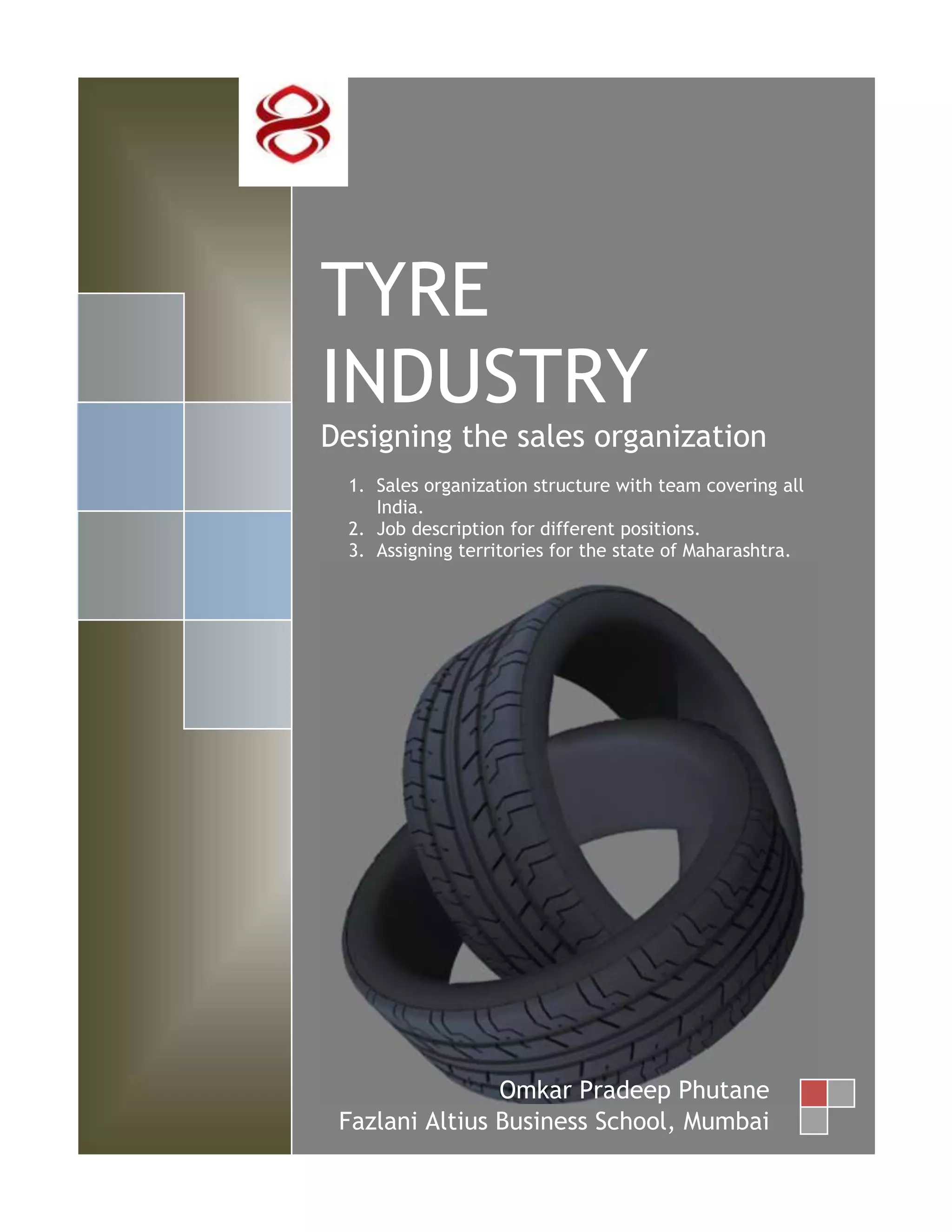 The document outlines the sales organization structure for a tire company covering all of India. It includes details on the different roles in the sales hierarchy from national sales manager down to sales executives. It also describes job responsibilities and qualifications for each role. Finally, it discusses assigning territories for sales coverage in the state of Maharashtra by dividing it into six divisions.
