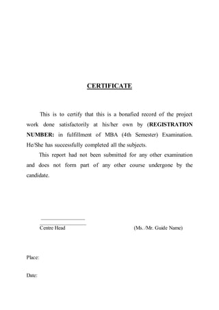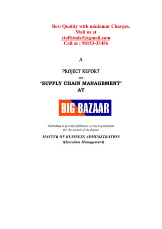The document is a project report on 'supply chain management' submitted for a Master's degree in Business Administration, confirming the originality and satisfactory completion of the project work by the student. It includes sections on the introduction to the Future Group, their vision and mission, personal contributions, recommendations, limitations, and bibliographies. Additionally, the document offers professional management study assistance services for project reports at competitive prices.