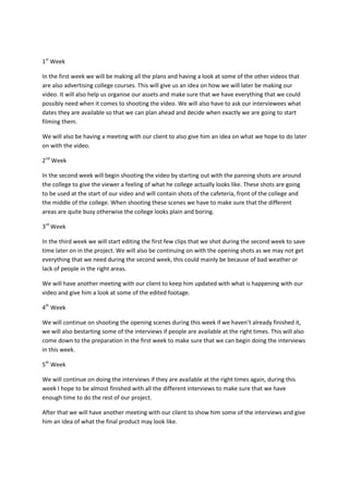 The document provides a detailed project schedule for creating an advertisement video over 8 weeks. It outlines the key tasks such as preparing plans, shooting footage, conducting interviews, editing videos, and getting client feedback at various stages. The schedule was initially unrealistic but was later revised to include more preparation time upfront, shooting opening scenes over multiple weeks, editing concurrently, and adding buffer time at the end to account for any delays.
