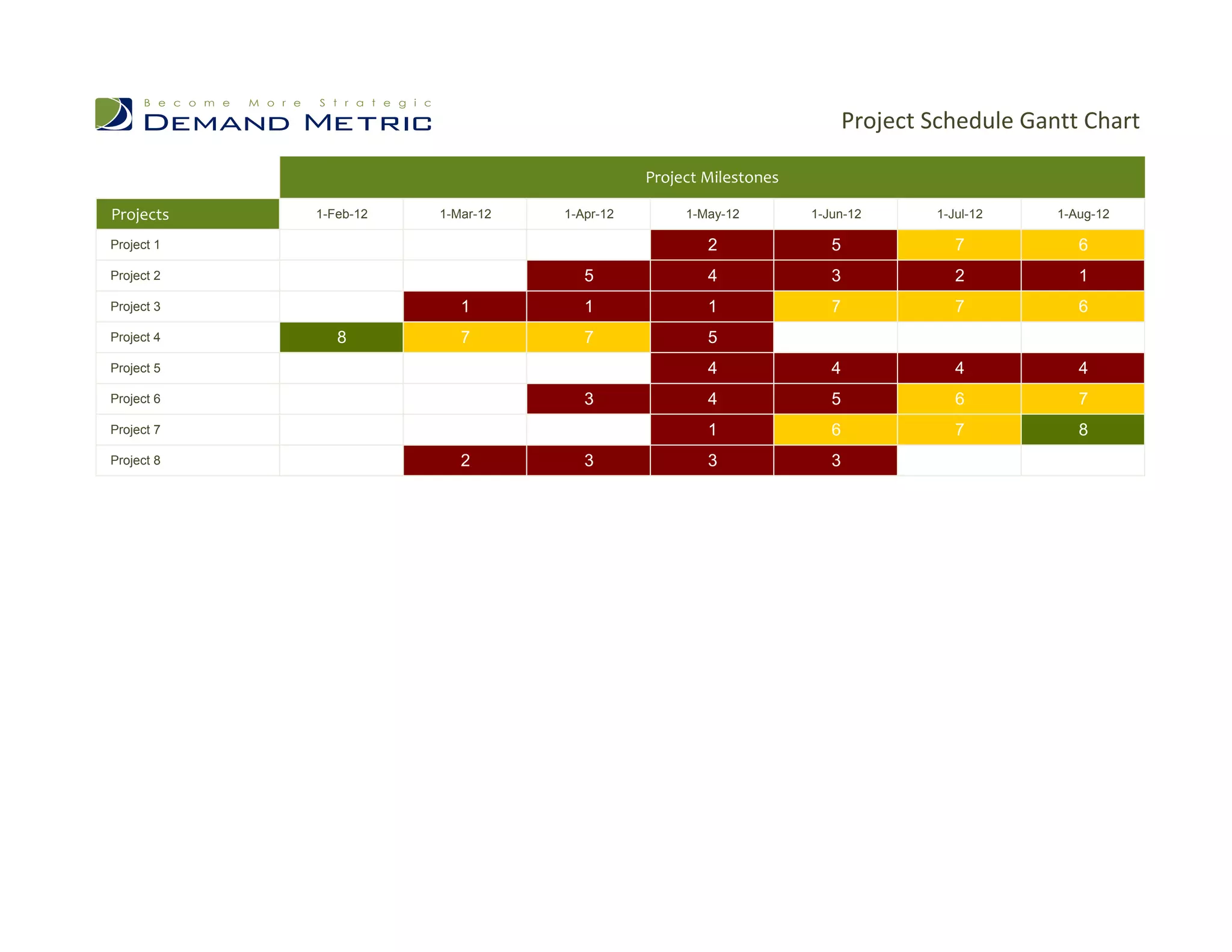 The document shows a Gantt chart projecting the progress of 8 projects from February to August 2012. Project 4 starts with the most progress in February at 8, while most other projects begin with no progress. By May, Project 3 and 6 show the most progress at 7. The chart tracks each project's scheduled progress over the 8 month period.