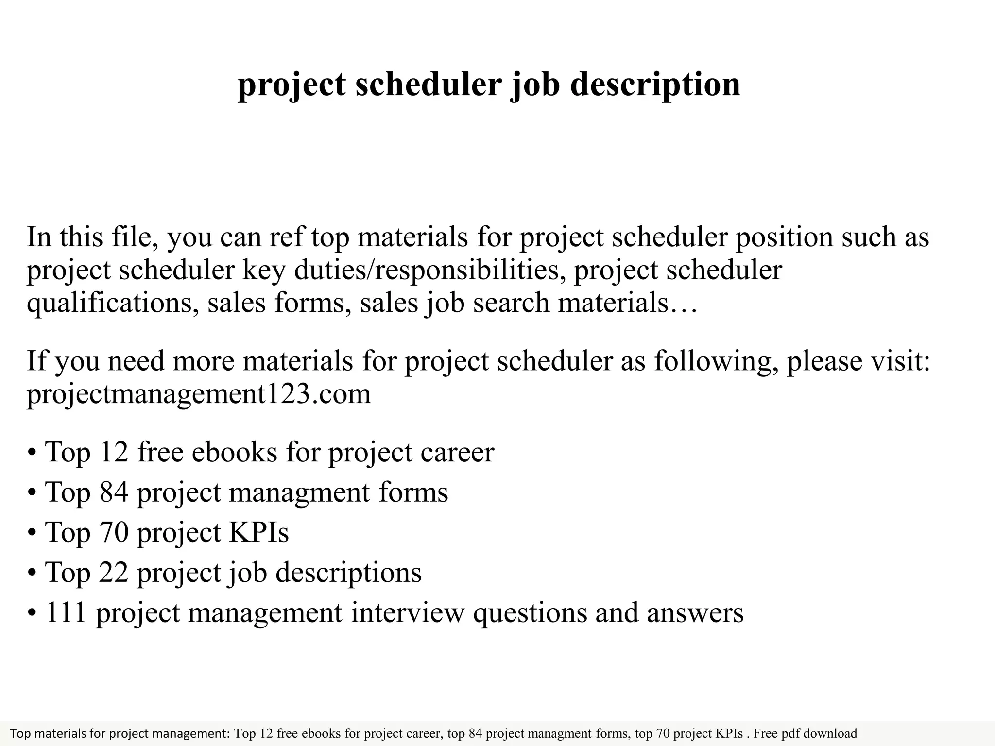 The document outlines the job description for a project scheduler, detailing key responsibilities such as creating project schedules, managing manpower, and supporting project management and sales teams. It also specifies qualifications required for the role, including proficiency in Microsoft Project and relevant educational background. Additionally, it provides resources for further materials related to project management.