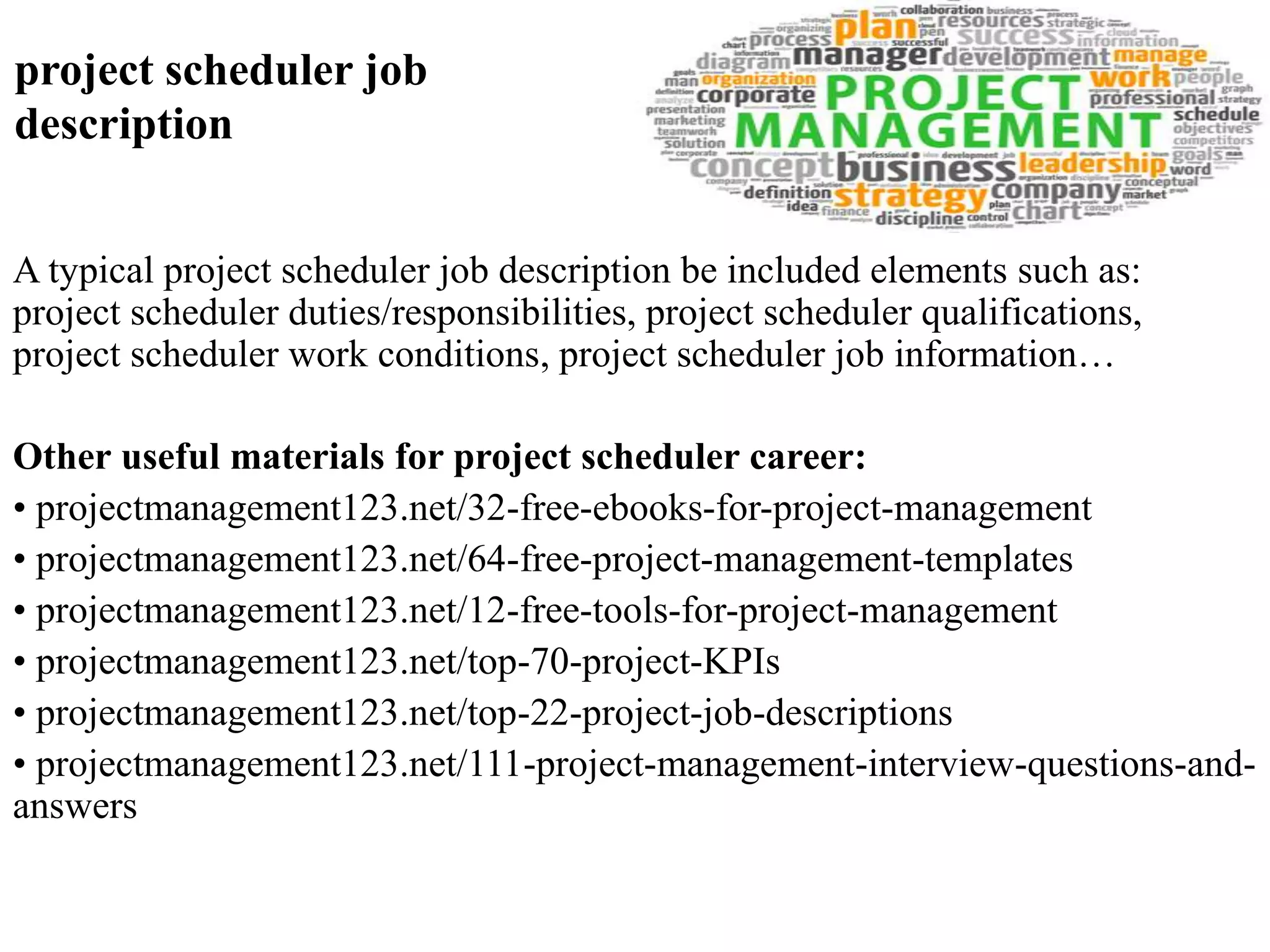 The document outlines a comprehensive job description for a project scheduler, covering key duties, qualifications, and working conditions. Responsibilities include creating schedules, managing resources, and coordinating with various departments, while qualifications necessitate proficiency in Microsoft Project and a relevant degree. Additionally, it provides resources for career development and links to helpful project management materials.