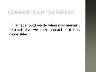 The document discusses software project scheduling and how to respond when management demands an impossible deadline. It describes how to create a macroscopic schedule that identifies major software engineering activities, allocates estimated effort across the planned duration, and defines responsibilities, outcomes, and milestones. It also provides an example of how adding people to a team can decrease overall productivity due to increased communication paths, and an equation for calculating effort expended based on lines of code, people, and time.