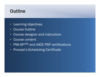 This document provides an outline for a course on project scheduling and controls. The 3-day course will introduce key concepts in project scheduling including activity sequencing, developing project schedules, schedule updates and change control, and earned value management. Participants will learn to create effective project schedules, implement controls, evaluate metrics and prepare reports. The course aims to prepare attendees to sit for the PMI Scheduling Professional or AACE Project Scheduling Professional certifications. It will use exercises, workshops, and a case study to demonstrate scheduling skills across different project types.