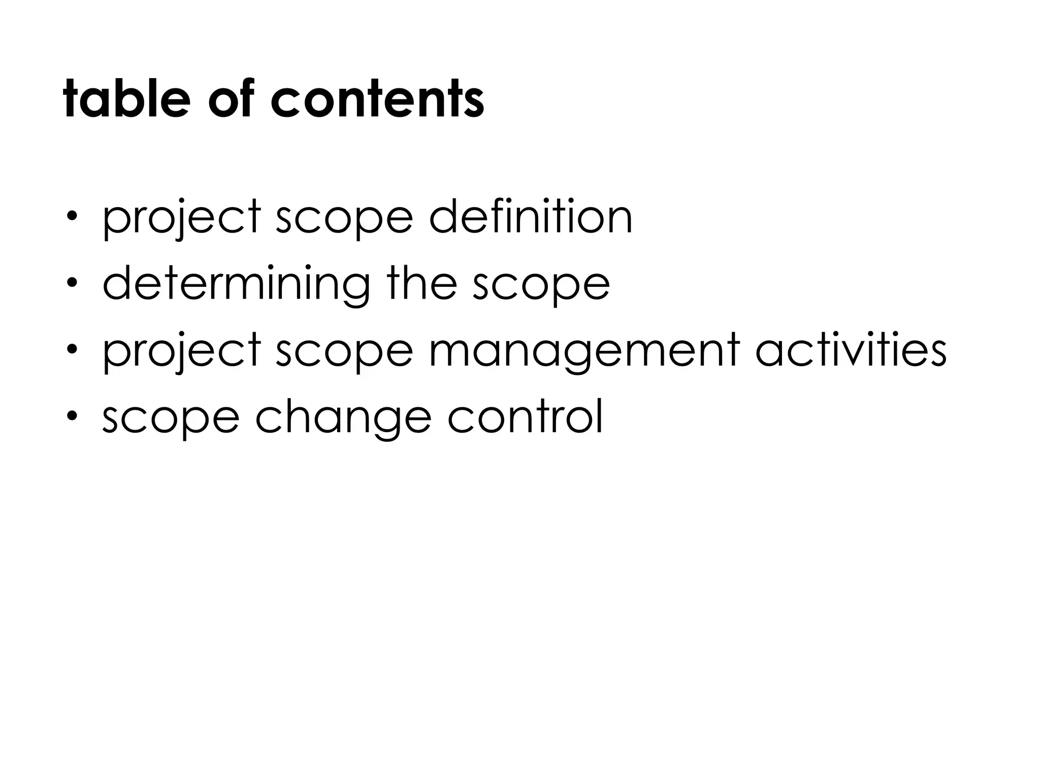 This document discusses project scope management. It defines project scope as what is included in and excluded from a project, including the expected cost and timeline. The key activities of project scope management are scope planning, scope definition, creating a work breakdown structure (WBS), scope verification, and scope control. Any changes to the project scope require scope change control procedures. Effective scope management helps ensure a project delivers the intended outcomes within budget and schedule.
