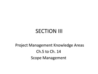Project scope management includes processes for defining and controlling what work needs to be done to deliver the project, beginning with developing a scope management plan, collecting requirements, and creating a detailed project scope statement that outlines the deliverables, exclusions, assumptions and acceptance criteria. It also involves breaking the work down into a work breakdown structure and validating that the project scope accurately reflects stakeholder needs through requirements traceability and change control. Effective scope management is crucial for project success by ensuring the project includes all necessary work and only the work required to complete the project.