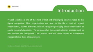 The document discusses the critical process of project selection for Six Sigma companies, emphasizing the need for a disciplined approach. It outlines a three-step method involving the establishment of a steering committee, generation of project ideas, and assessment and prioritization using a project selection matrix. Successful project alignment with organizational strategy is highlighted as essential for impactful outcomes.