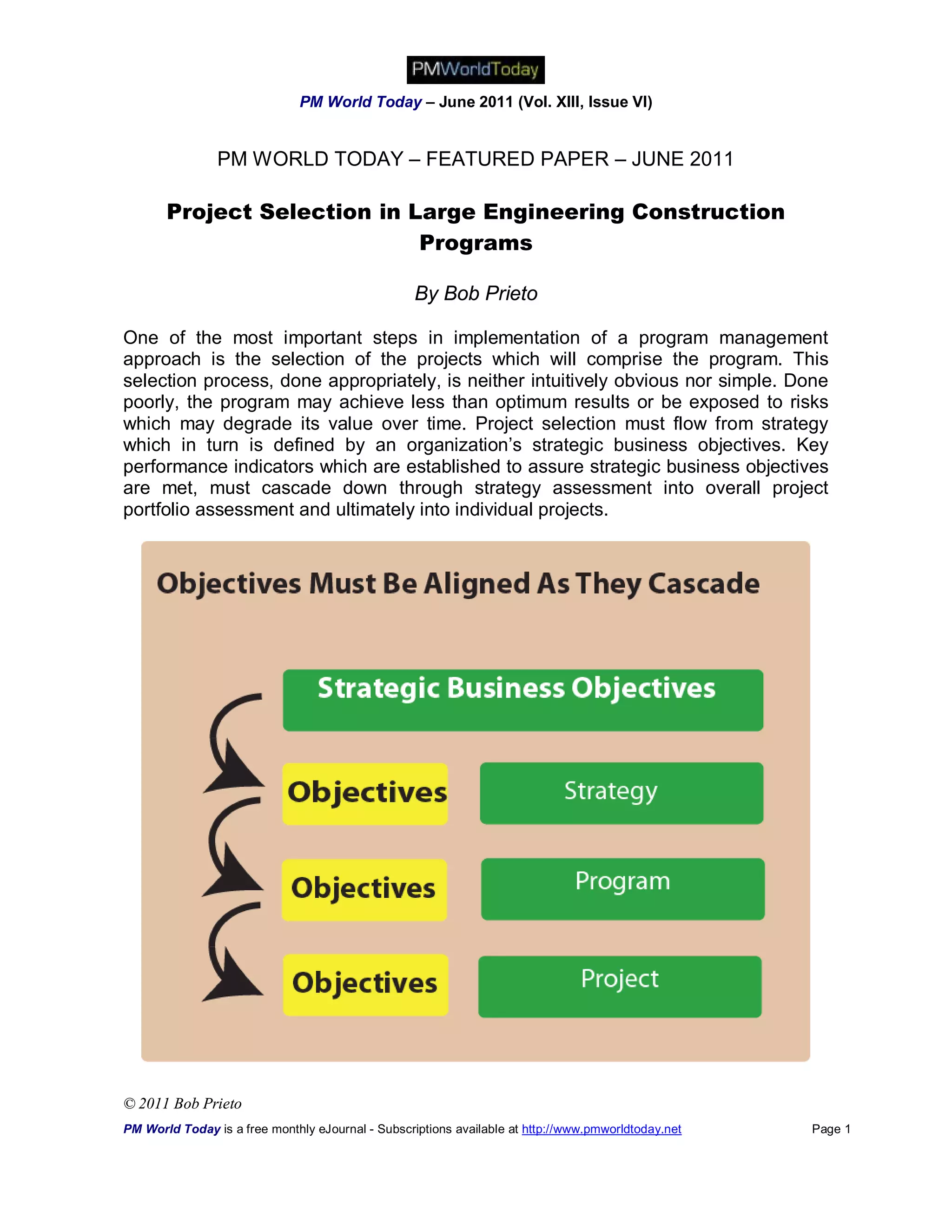 The document discusses the critical importance of project selection in large engineering and construction programs, emphasizing that it must be aligned with an organization's strategic business objectives and involve careful evaluation of various factors, including interdependencies and resource constraints. It warns against biases in the project selection process and recommends a methodology that includes objective performance metrics and the elimination of heuristic biases. Successful project portfolios are characterized by their alignment with strategic goals, resilience to uncertainties, and a structured decision-making process that addresses risk and project interdependencies.