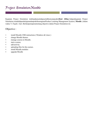 This project simulation was a 7-day learning and practice activity for Bootcamp participant Deni Alfian focused on the Product Learning Management System Moodle. The objectives were to install Moodle on Windows and Linux, change Moodle themes, manage and start courses, add activities, upload files, install modules, and upgrade Moodle.