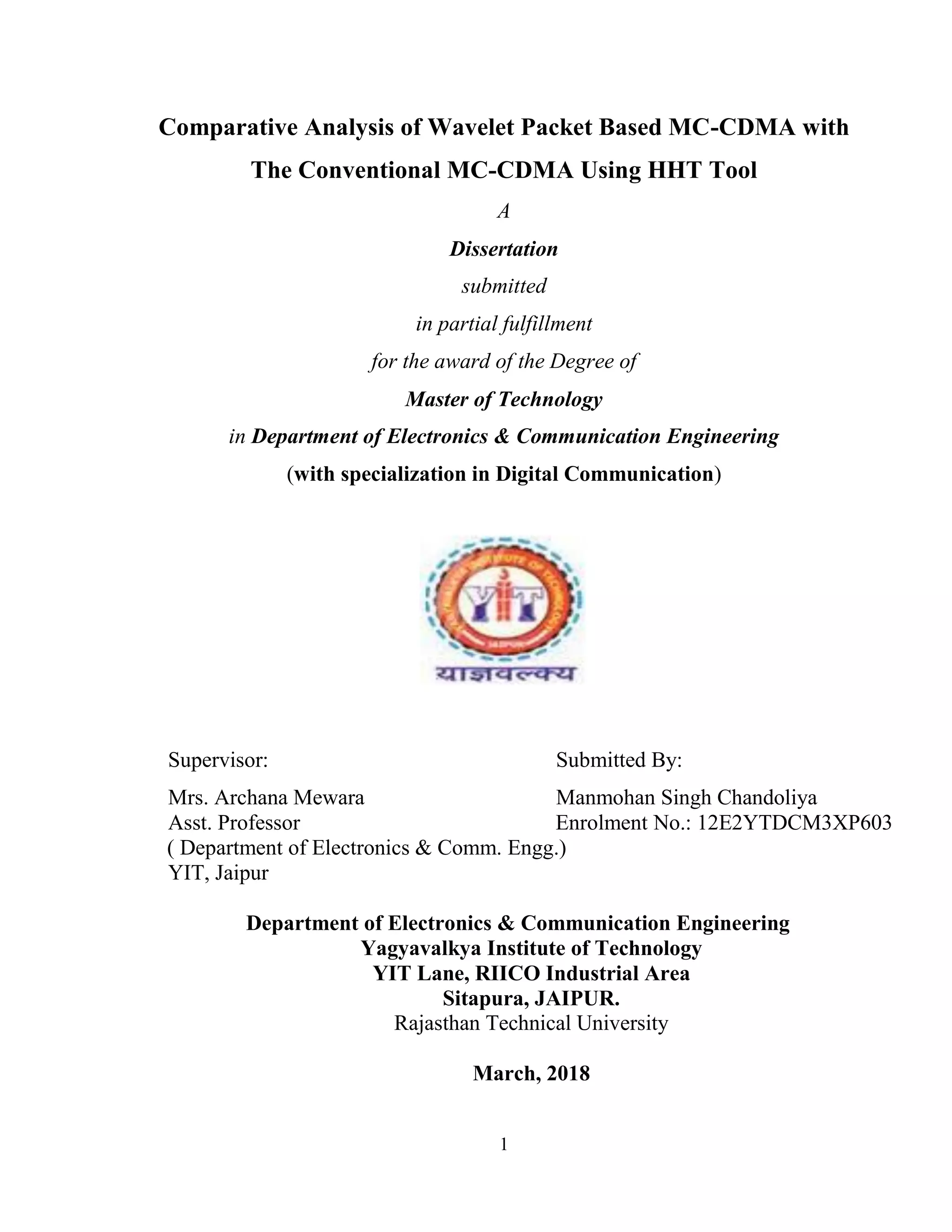 This document appears to be a dissertation submitted for a Master's degree in digital communication engineering. It discusses comparative analysis of wavelet packet based MC-CDMA and conventional MC-CDMA systems. The dissertation includes sections on literature review, wavelet packets, MC-CDMA systems, wavelet packet based MC-CDMA system, performance measures, methodology, and expected outcomes. The student conducted this research under the guidance of their supervisor.