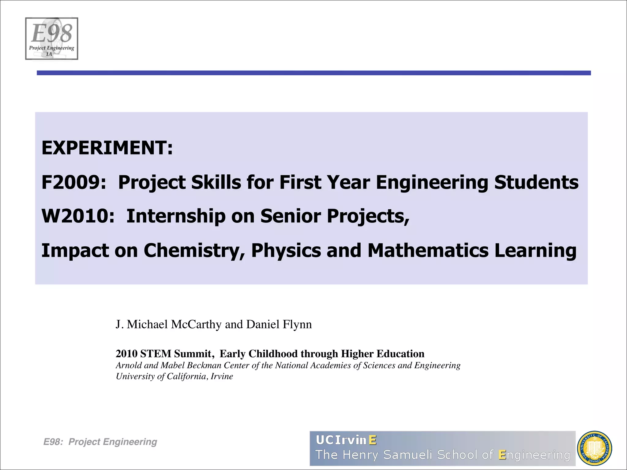 This document describes an experiment to determine if providing first-year engineering students with project skills training and internships on senior projects impacts their learning of chemistry, physics, and mathematics. The experiment involves measuring students' grades before and after a freshman project course that teaches skills like safety, documentation, and team management, and after interning on senior design projects. The hypothesis is that experience applying fundamentals through projects will improve students' mastery of related math and science topics.